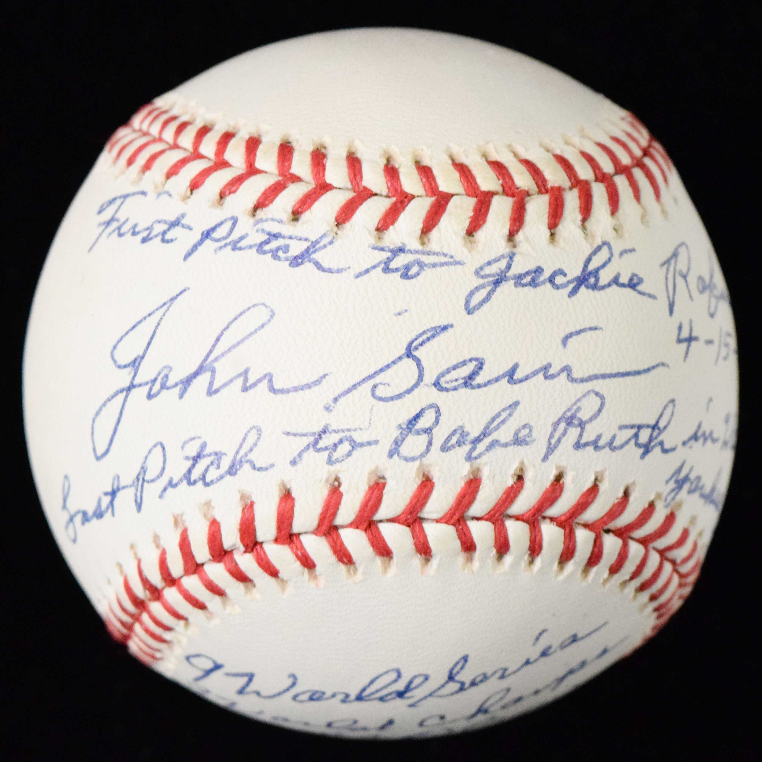 Description:John Sain signed baseball with lengthy inscriptions - JSA (NM). L.Coleman NL ball signed by Sain in blue ink with "Last Pitch to Babe Ruth in War Benefit game Yankee Stadium 7-28-43" "First Pitch to Jackie Robinson 4-15-47" "9 World Series" "3 World Champs as Player" "3 World Champs" as Coach" inscriptions. Signature rates 9 out of 10. JSA serial #ed sticker is on the ball: NM