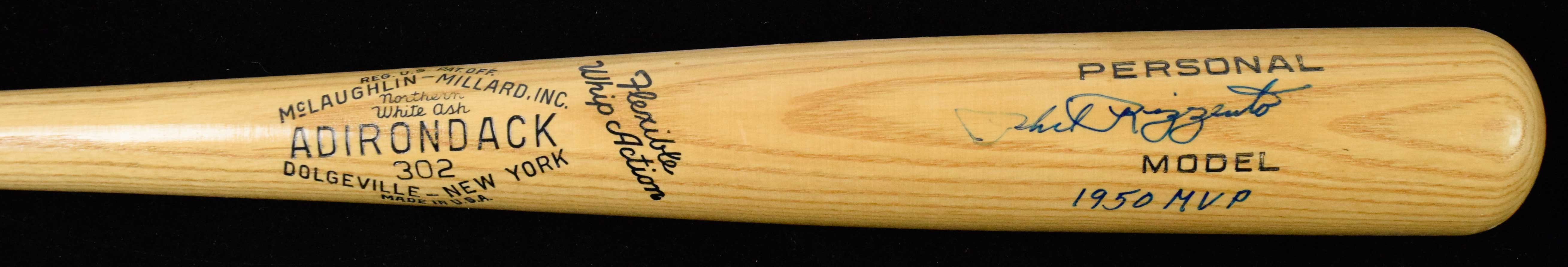 Description:Phil Rizzuto signed and inscribed baseball bat - JSA (NM). 34" Adirondack signed by Rizzuto in blue marker with "1950 MVP" inscription. Signature rates 8 out of 10. JSA serial #ed sticker is on the bat: NM