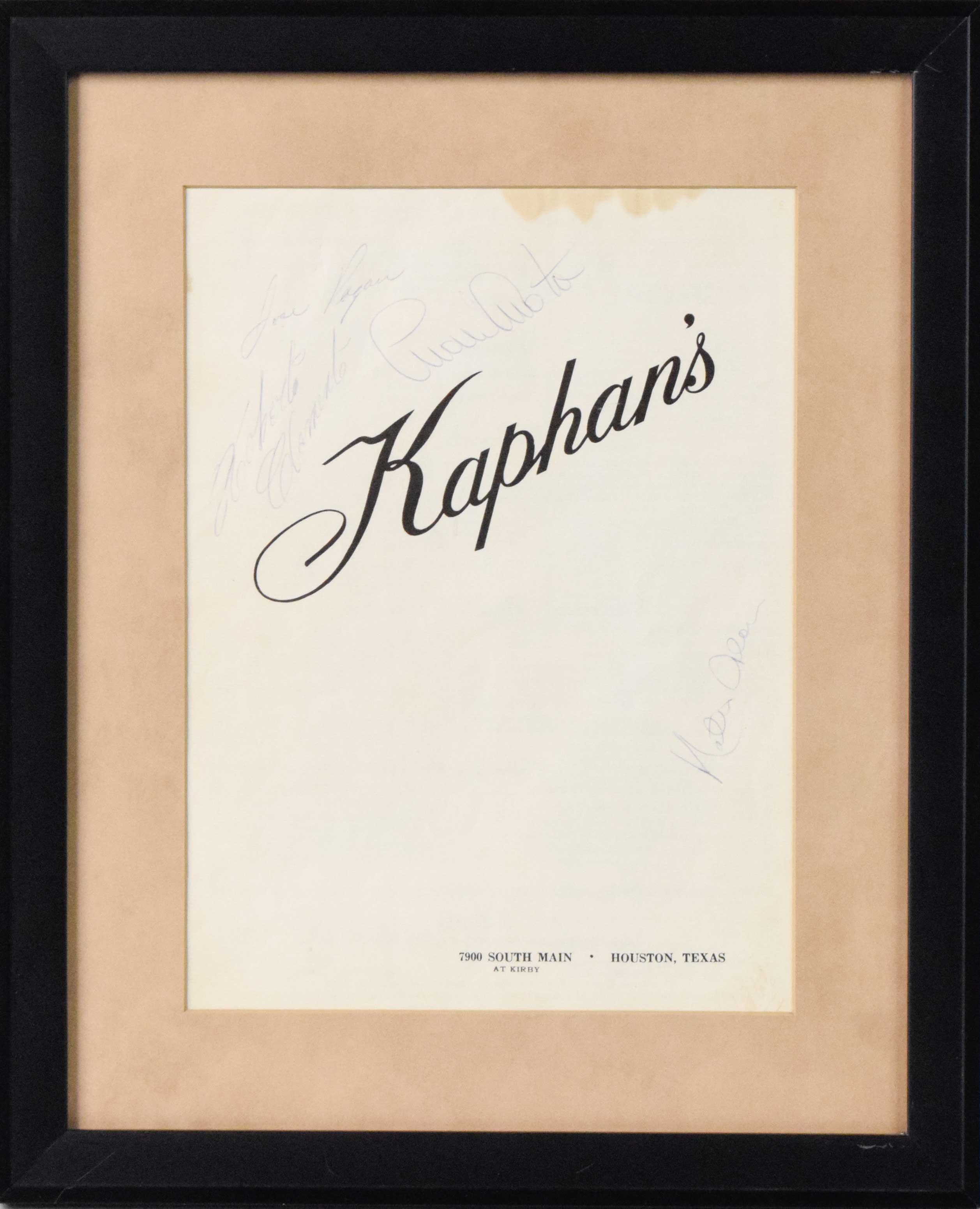 Description:Roberto Clemente (and others) autographed "Kaphan's" menu (full JSA LOA) (Overall EX) Paper stock menu from the Houston, TX based eatery has been signed by Roberto Clemente, Manny Mota, Joe Pagan, and Matty Alou. Ink signatures rate 7 to 7/8 out of 10. Framed to 13.75"x16.75" (glass on both sides) with some light general wear visible including a stain at the top. Includes full LOA from JSA: EX ($750-$1,000)