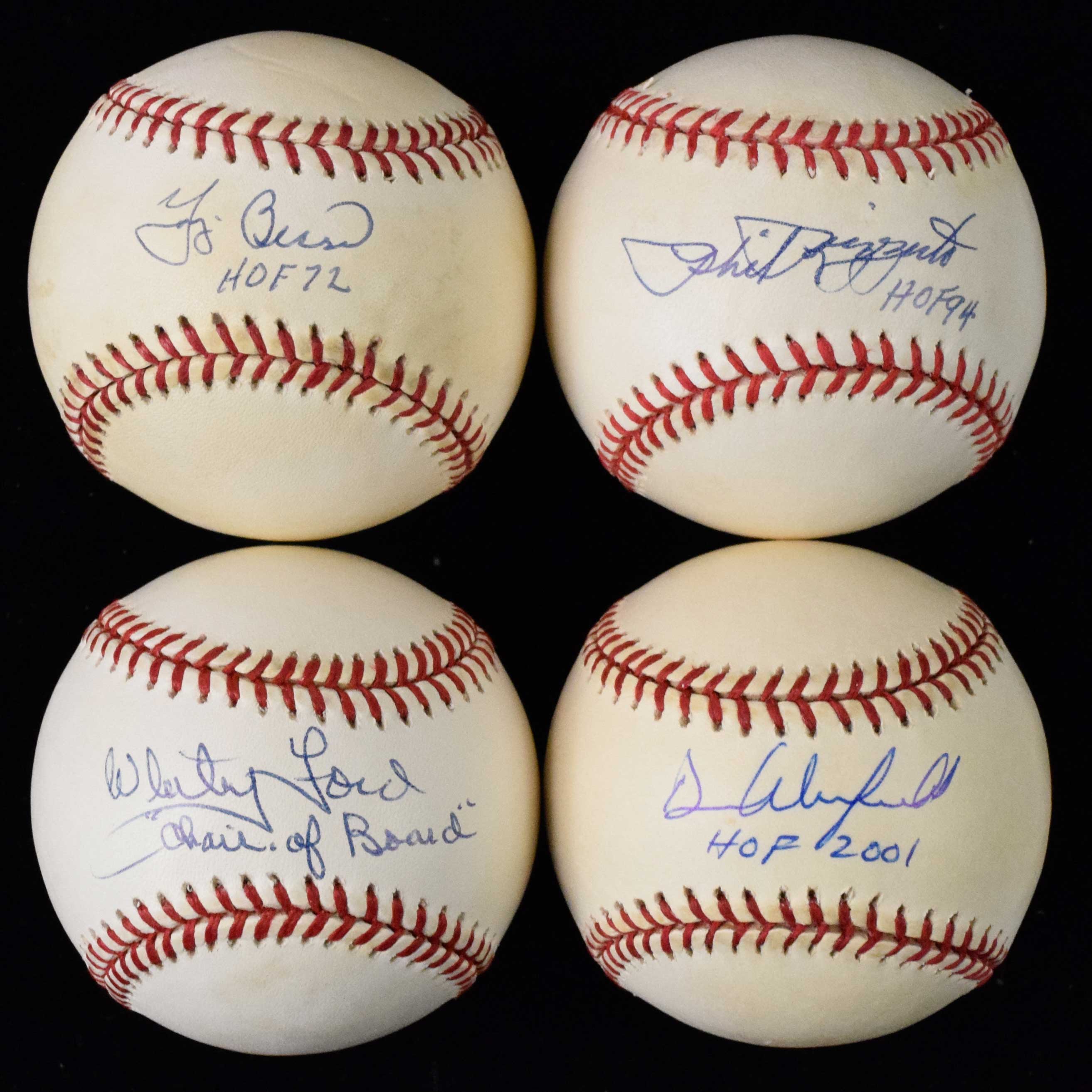 Description:Lot of (4) Yankees Hall of Famer single signed balls with inscriptions (EX-NM) Rawlings Official American or Major League baseballs including Yogi Berra, Phil Rizzuto, and Dave Winfield with HOF inscriptions. Whitey Ford has inscribed "Chair. Of Board." Ink signatures rate 8 out of 10, light to mild toning: EX-NM