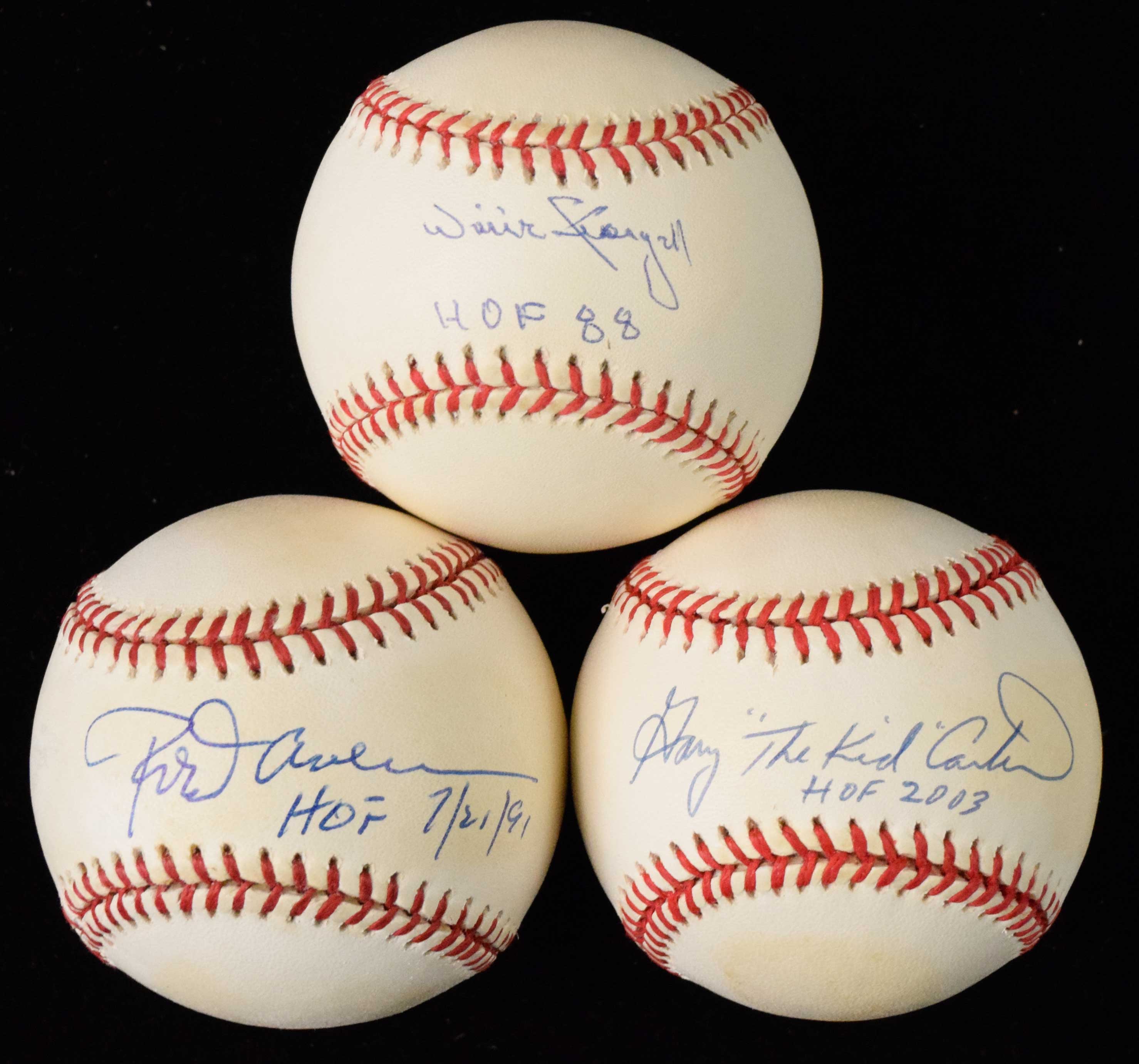 Description:Willie Stargell, Gary Carter, and Rod Carew "HOF" inscribed single signed baseballs (EX/MT-NM) Rawlings Official American or National League baseballs, each signed in ink rating 8 to 8/9 out of 10. Light to mild scattered toning: EX/MT-NM