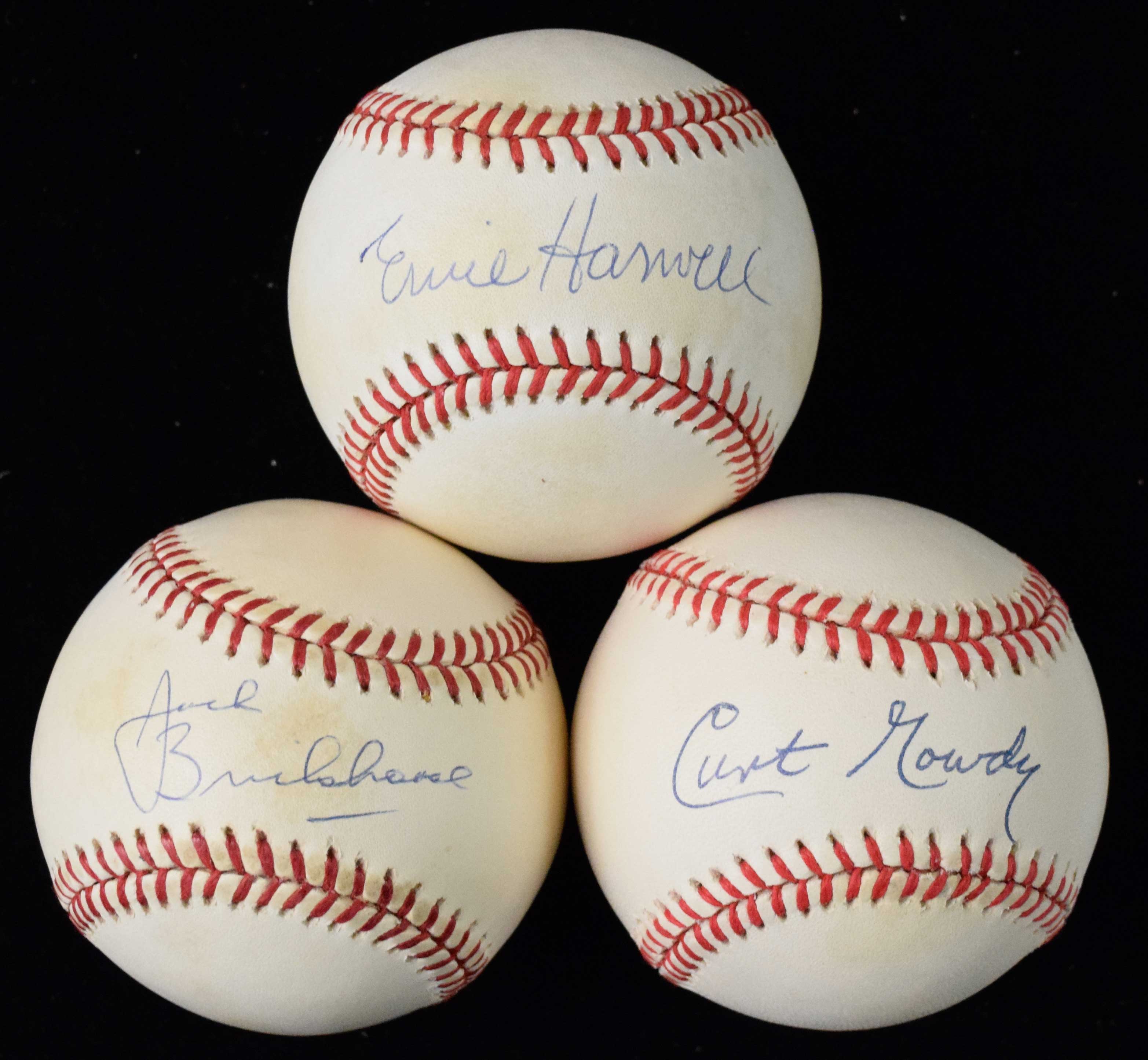 Description:Jack Brickhouse, Curt Gowdy, and Ernie Harwell single signed baseballs (EX/MT-NM) Rawlings Official American or National League baseballs, each signed in ink rating 8 out of 10. Hint of light toning: EX/MT-NM