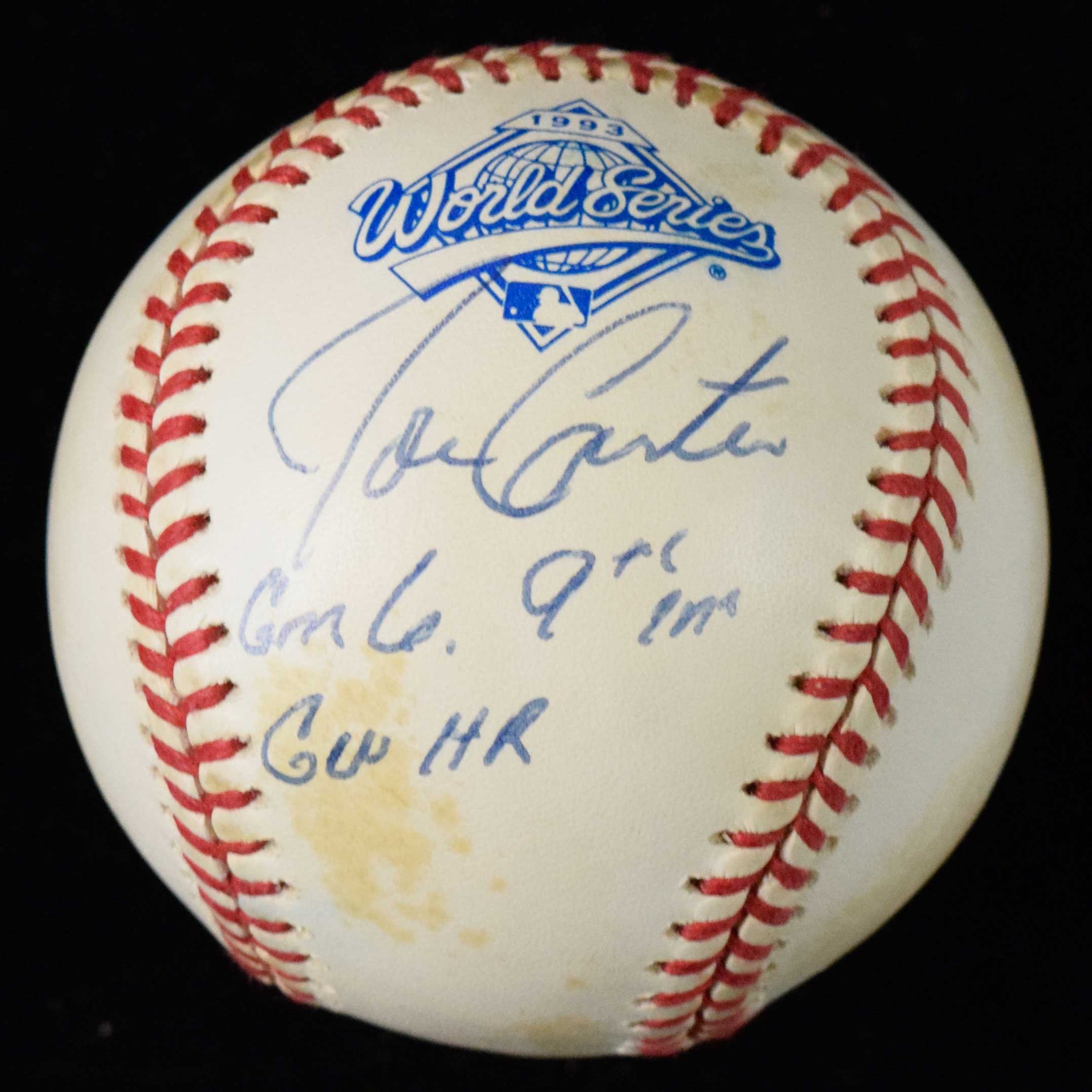 Description:Joe Carter single signed 1993 World Series logo baseball with related inscription (EX/MT) Rawlings Official game logo ball has been signed in ink rating 8 out of 10 with related inscription below. Light scattered spotting/toning: EX/MT