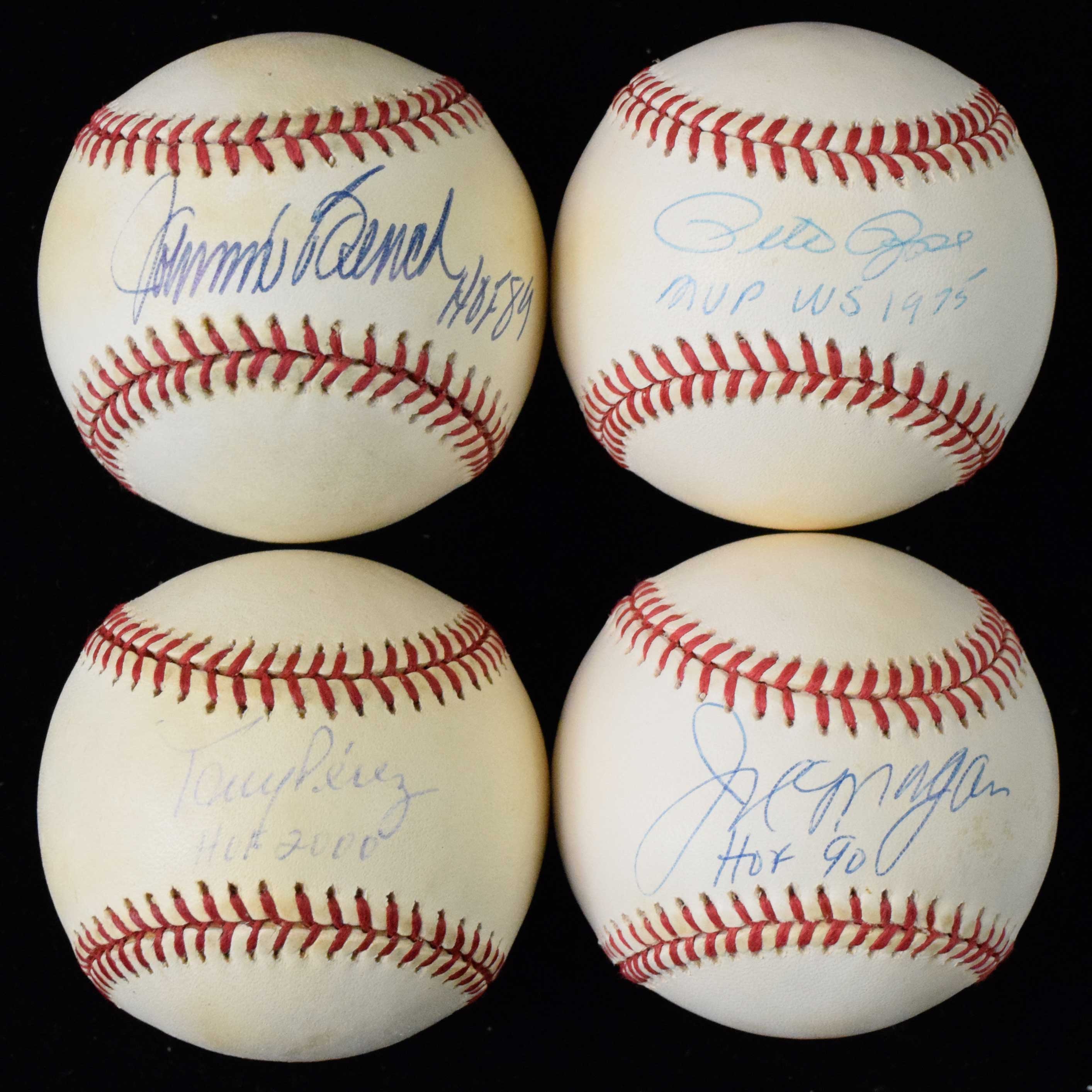 Description:Lot of (5) Big Red Machine HOFer/star signed baseballs with inscriptions (EX-NM) Rawlings Official National or year 2000 logo MLB Official baseballs. Includes Pete Rose with 1975 MVP WS inscription and HOF inscribed balls of Sparky Anderson, Joe Morgan, Johnny Bench, and Tony Perez. Signatures rate 7/8 to 8 out of 10 with Perez a 7. Light to moderate toning is most pronounced on Bench ball: EX-NM