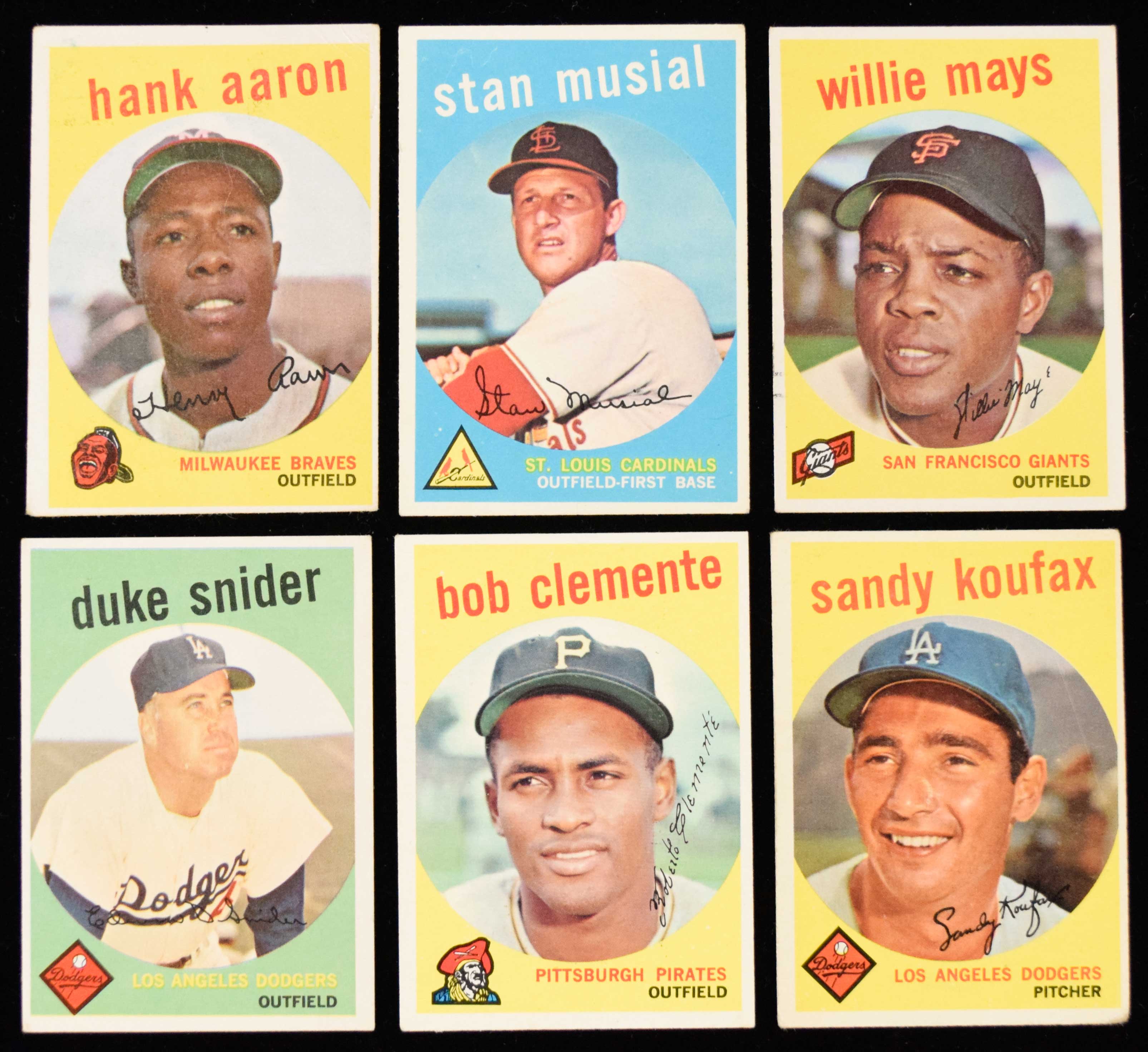 1959 Topps Baseball near complete set (564 of 572 cards) General range runs GD-EX with VG average condition throughout. Keys: #20 Snider (VG/EX), 30 Fox (VG), 50 Mays (EX, minor print defect on left edge), 150 Musial (EX), 163 Koufax (GD), 180 Berra (FR/GD), 202 Maris (VG), 212 Fence Busters (GD/VG), 317 Ashburn/Mays (VG/EX), 338 Anderson (EX), 350 Banks (VG), 360 Kaline (EX), 380 Aaron (GD), 387 Drysdale (GD), 430 Ford (VG/EX), 435 Robinson (VG/EX), 439 Robinson (VG), 450 Mathews (EX OC), 461 Mantle HR (GD), 464 Mays Catch (VG), 478 Clemente (EX), 515 Killebrew (GD), 543 Trio (EX), 553 Campanella (VG), 559 Banks (VG), 561 Aaron (EX OC), 563 Mays (VG), and 564 Mantle (miscut). Missing #10 Mantle, 25, 200, 405, 407, 408, 514 Gibson, and 562 Kaline: Avg. VG ($1,000-$2,000)