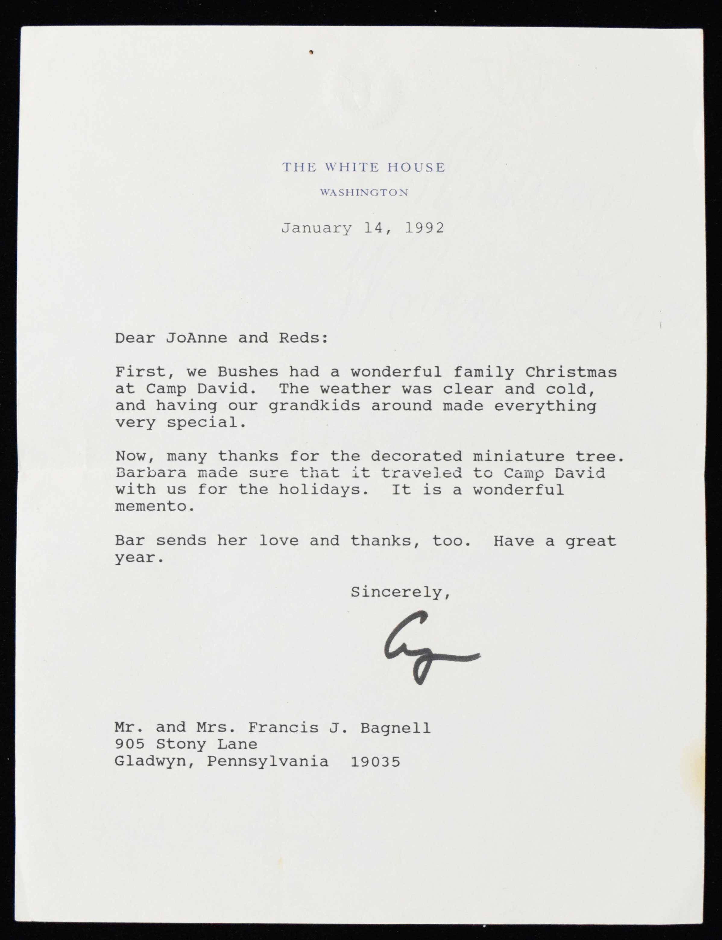 Description:1992 George H. W. Bush signed letter on White House stationary (EX/MT) Black marker first name signature rating 9/10 out of 10 appears on January 14, 1992 dated letter. Content relates to the holidays and time spent at Camp David. Touch of light wear: EX/MT