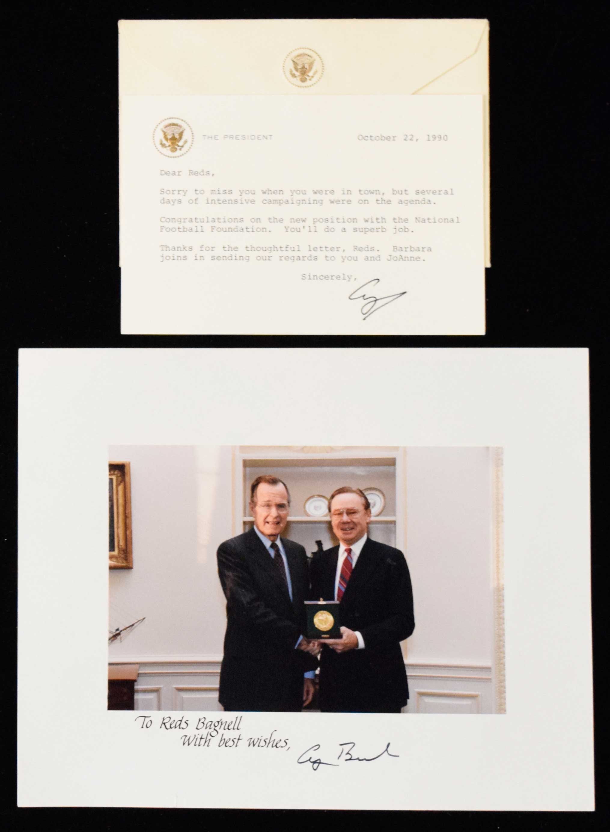 Description:George H. W. Bush signed note and 8"x10" photograph (EX-NM) Includes color photo has been signed "George Bush" in marker rating 8 out of 10 (inscribed "To Reds Bagnell" by the White House calligrapher). Light wear; October 1990 dated note on "The President" White House card which is written to Bagnell and signed "George" rating 8 out of 10: EX-NM