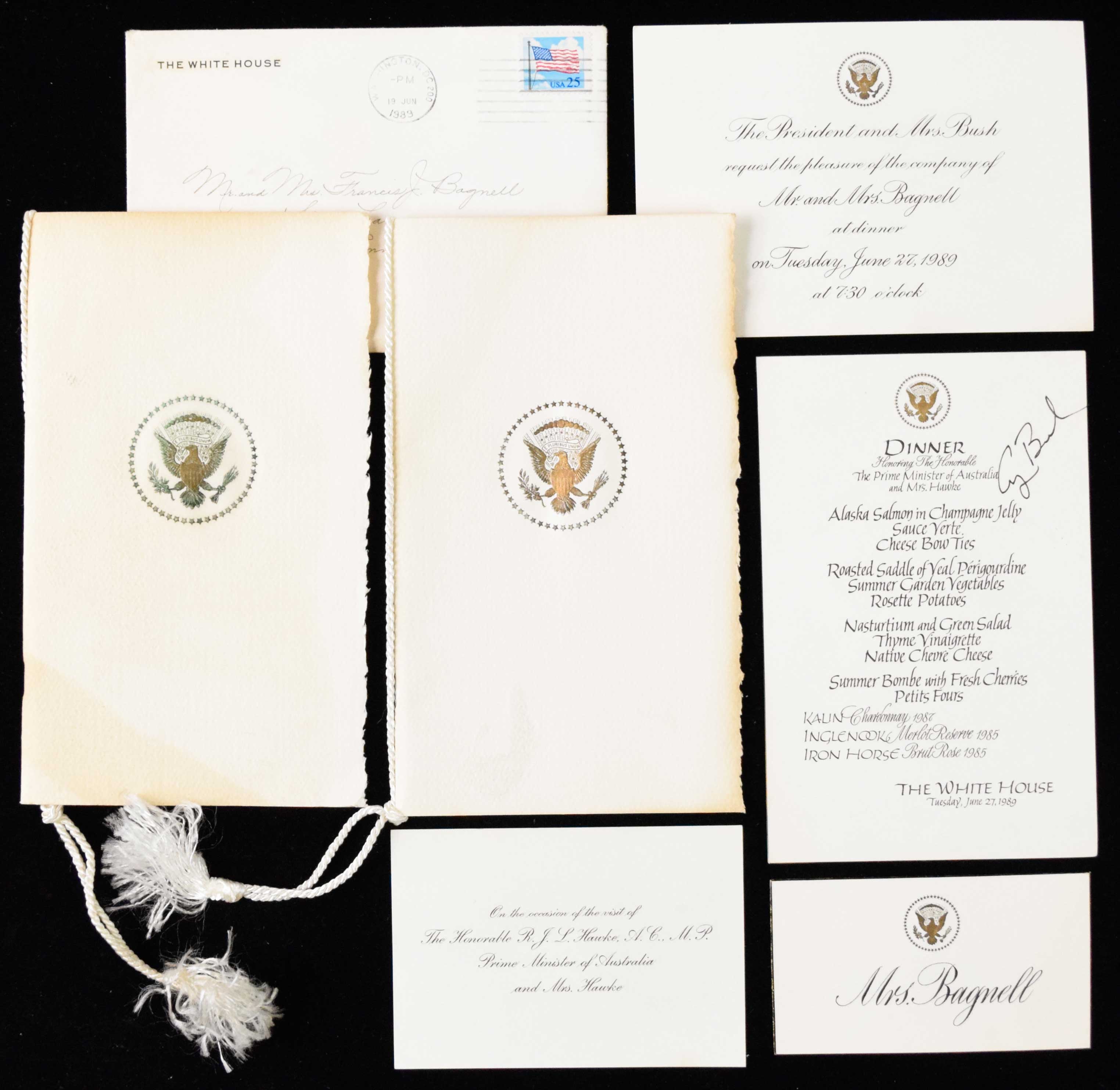 Description:George H. W. Bush signed 1989 White House Dinner menu with related pieces (EX-NM) Includes official White House issued dinner menu (on 4.5"x7" heavy stock) which has been signed "George Bush" in marker rating 8/9 out of 10. Also includes the original invitation to the event, a seating card, (2) programs, and an additional related piece. Light general wear including toning is slightly more accentuated on some pieces: EX-NM
