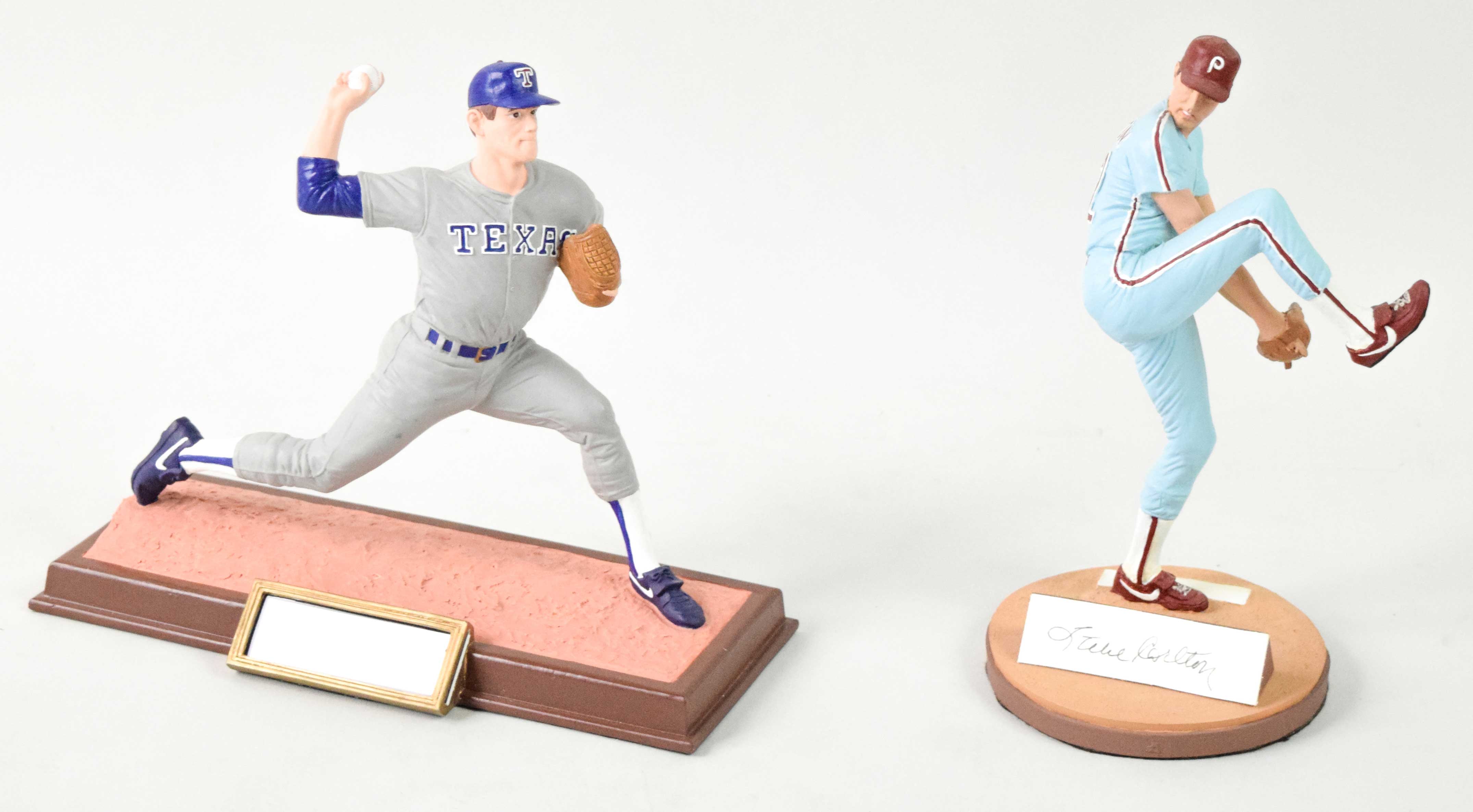 Description:Nolan Ryan and Steve Carlton autographed figures (NM) Includes Nolan Ryan by Sports Impressions and Steve Carlton by Gartlan. Each signed on the base rating 8 to 9 out of 10. Little mentionable wear. Includes original boxes: NM