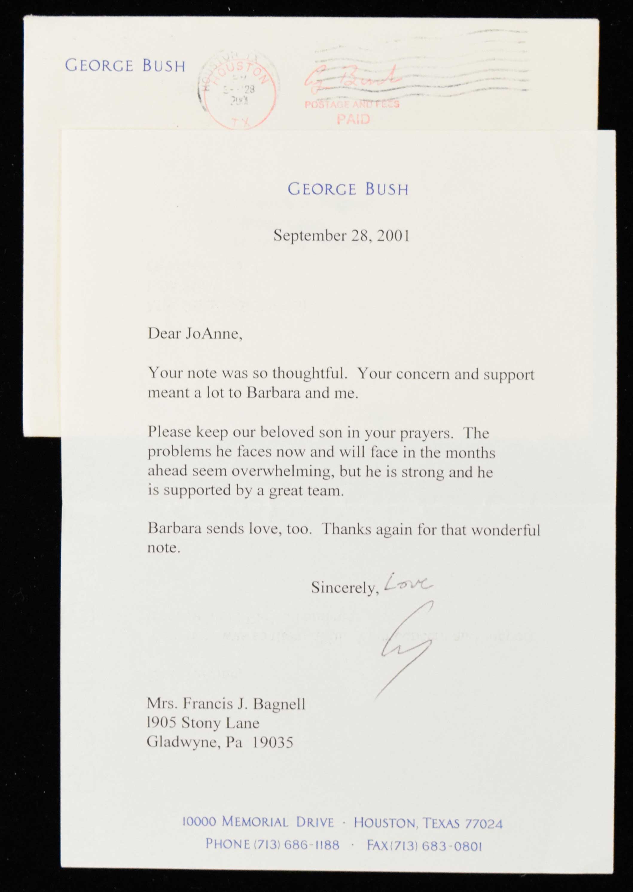 Description:September 2001 George H. W. Bush signed letter with outstanding content related to 9/11 and his son George W. (EX/MT) September 28, 2001 dated letter on his personal stationary has been signed "Love George" in ink rating 7/8 out of 10. Written just weeks after 9/11 it has outstanding content reading, "Your note was so thoughful. Your concern and support meant a lot to Barbara and me. Please keep our beloved son in your prayers. The problems he faces now and will face in the months ahead seem overwhelming, but he is strong and he is supported by a great team..." Typical fold line from mailing and a touch of other wear. Includes the original mailing envelope: EX/MT ($500-$1,000)
