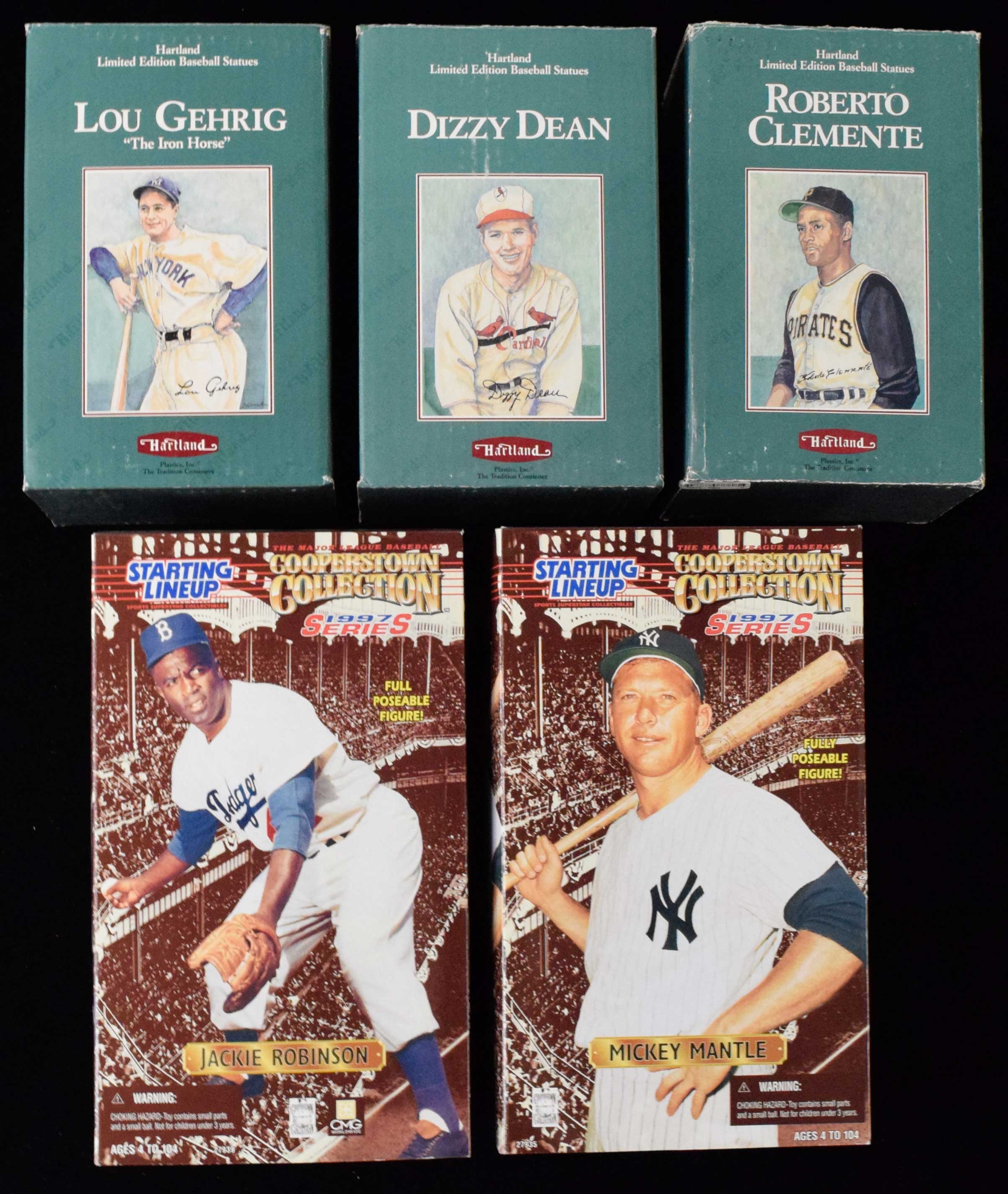 Description:Lot of (8) baseball related figures/statues (EX-NM) Includes 1990 Dallas Hartland statues of Dizzy Dean, Lou Gehrig, and Roberto Clemente; Salvino brand figure of Willie Stargell; 25th Anniversary re-issue Hartland of Eddie Mathews; 1997 Cooperstown Collection figures of Mickey Mantle and Jackie Robinson; small Jackie Robinson Sports Impressions figure. All pieces are in original boxes which show some light general handling and storage wear: EX-NM