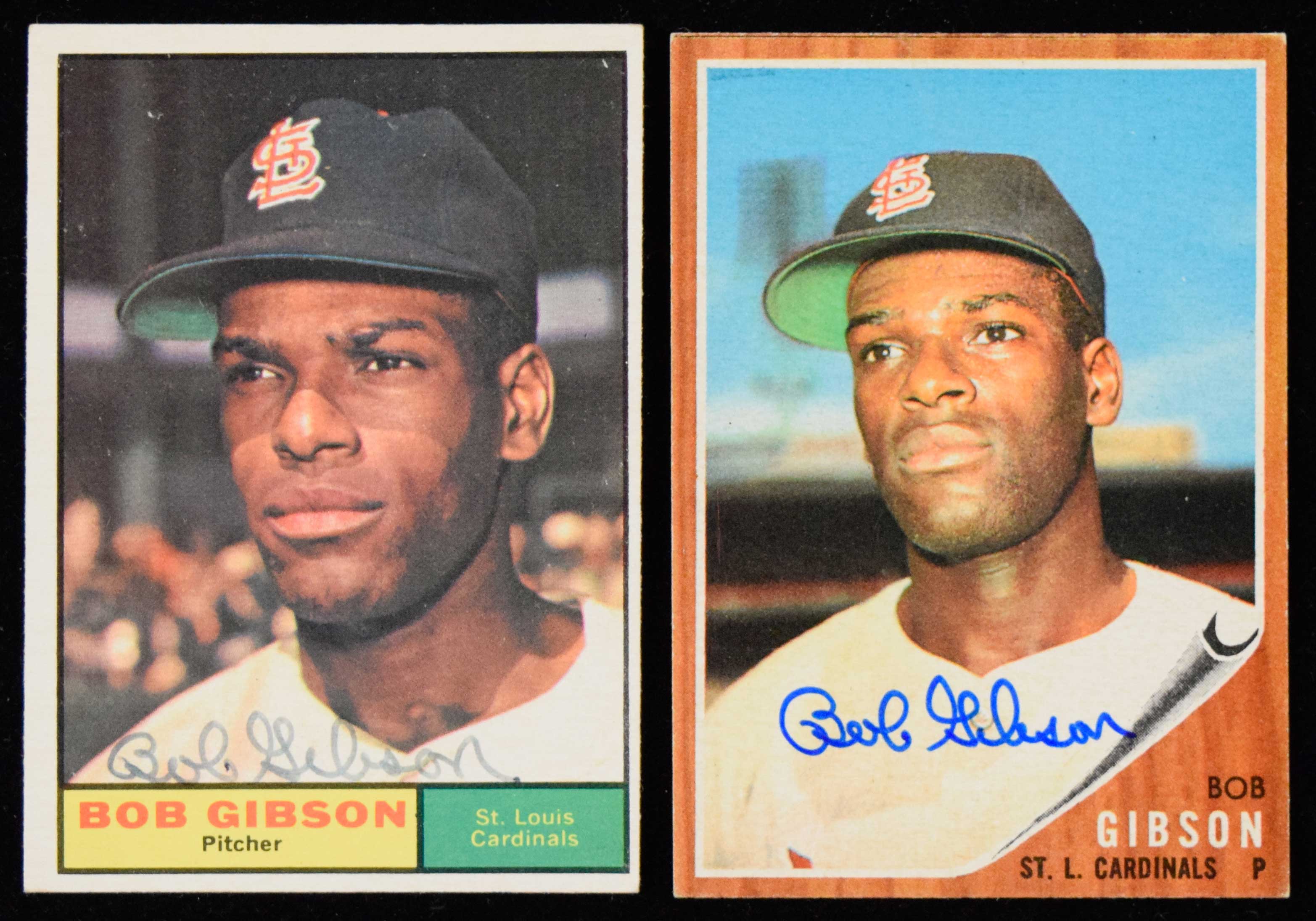 Description:Bob Gibson autographed 1961 and 1962 Topps baseball cards (Sigs. EX/MT- NM, Cards EX Includes 1961 Topps #211 (EX, JSA authentication sticker on back - COA is not included) and 1962 Topps #530 (EX). Each signed in marker rating 7/8 to 9 out of 10: Sigs. EX/MT-NM, Cards EX
