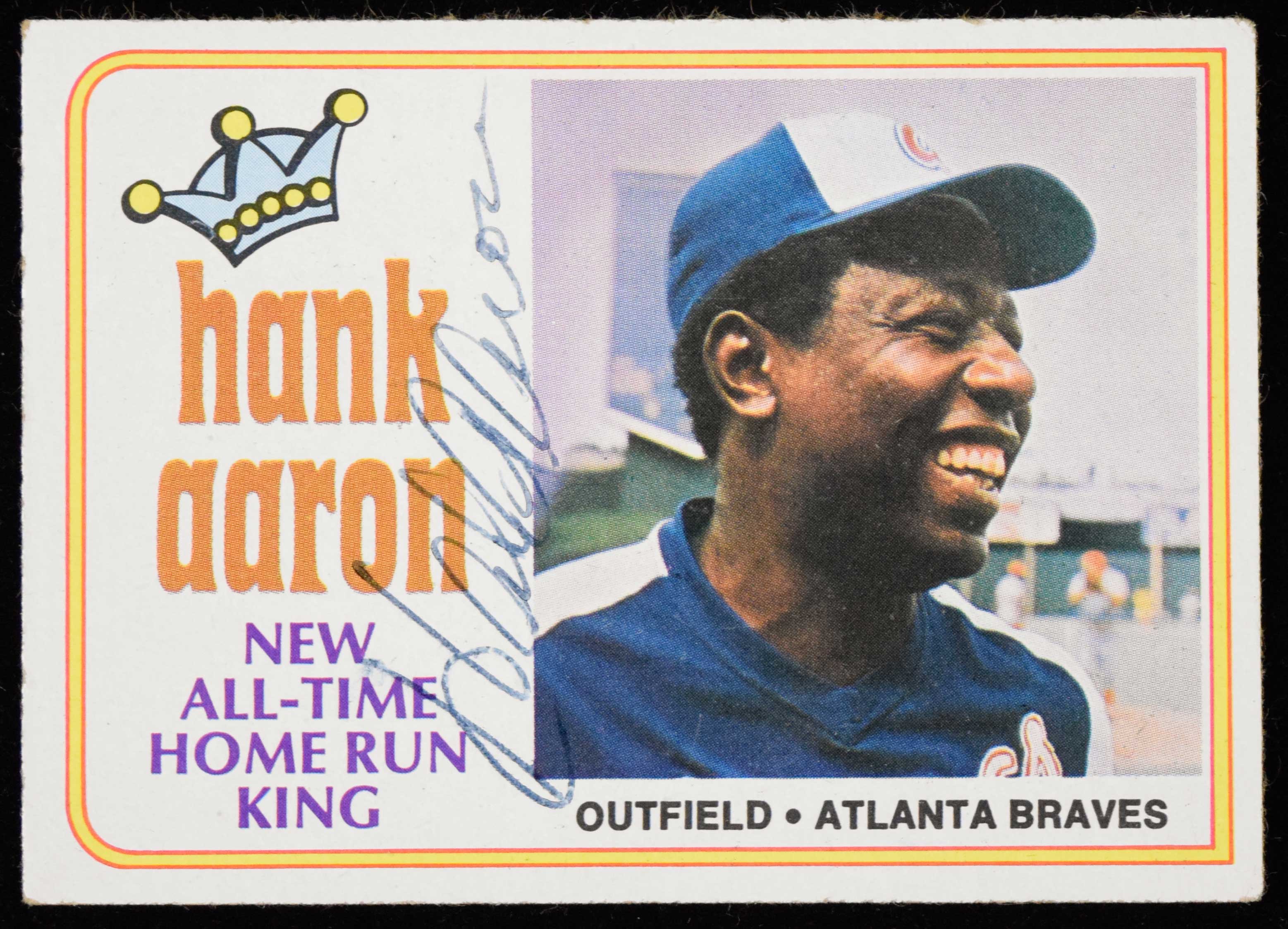 Description:1974 Topps #1 Hank Aaron autographed card (Sig. NM) Signed in ink rating 8 out of 10. Card has a hint of light corner/edge wear and a small notation on the back indicating that it was signed at an event in Pittsburgh in 1978. A small color photo of Aaron is included and was presumably taken the same day it was signed: Sig. NM, Card EX