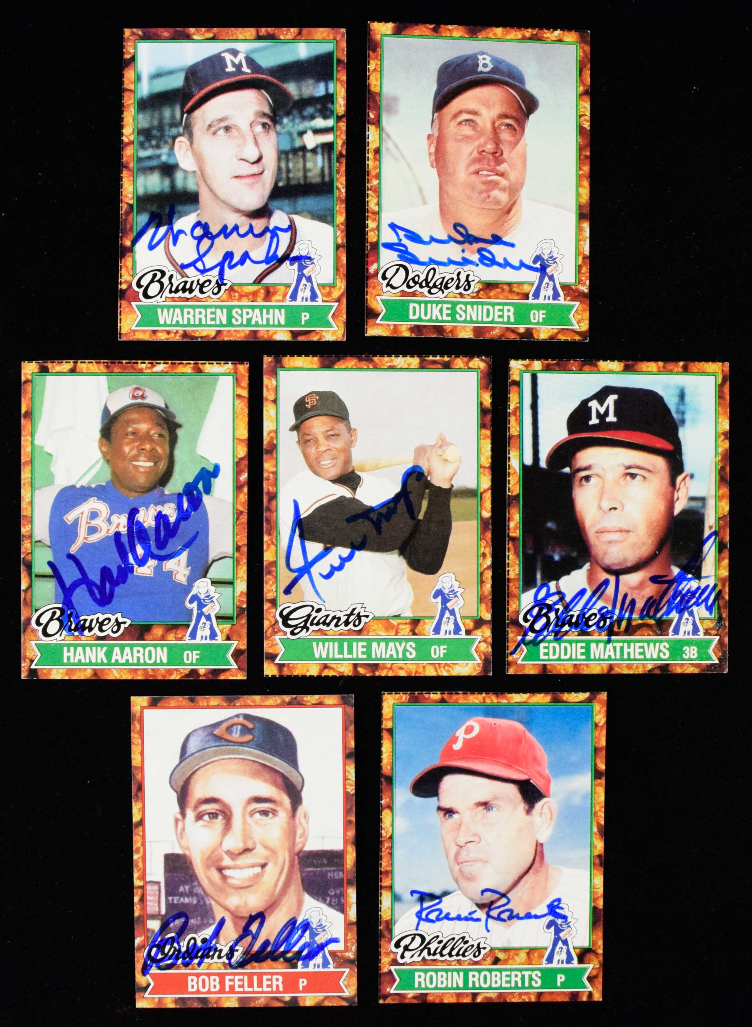 Description:Lot of (7) Hall of Famer signed 1982 Topps/Borden trading cards (EX/MT-NM) Includes Hank Aaron, Willie Mays, Duke Snider, Robin Roberts, Bob Feller, Eddie Mathews, and Warren Spahn. Marker signatures rate 8 to 9 out of 10. Cards were handcut from a larger sheet and may have just the slighest touch to corners: EX/MT-NM