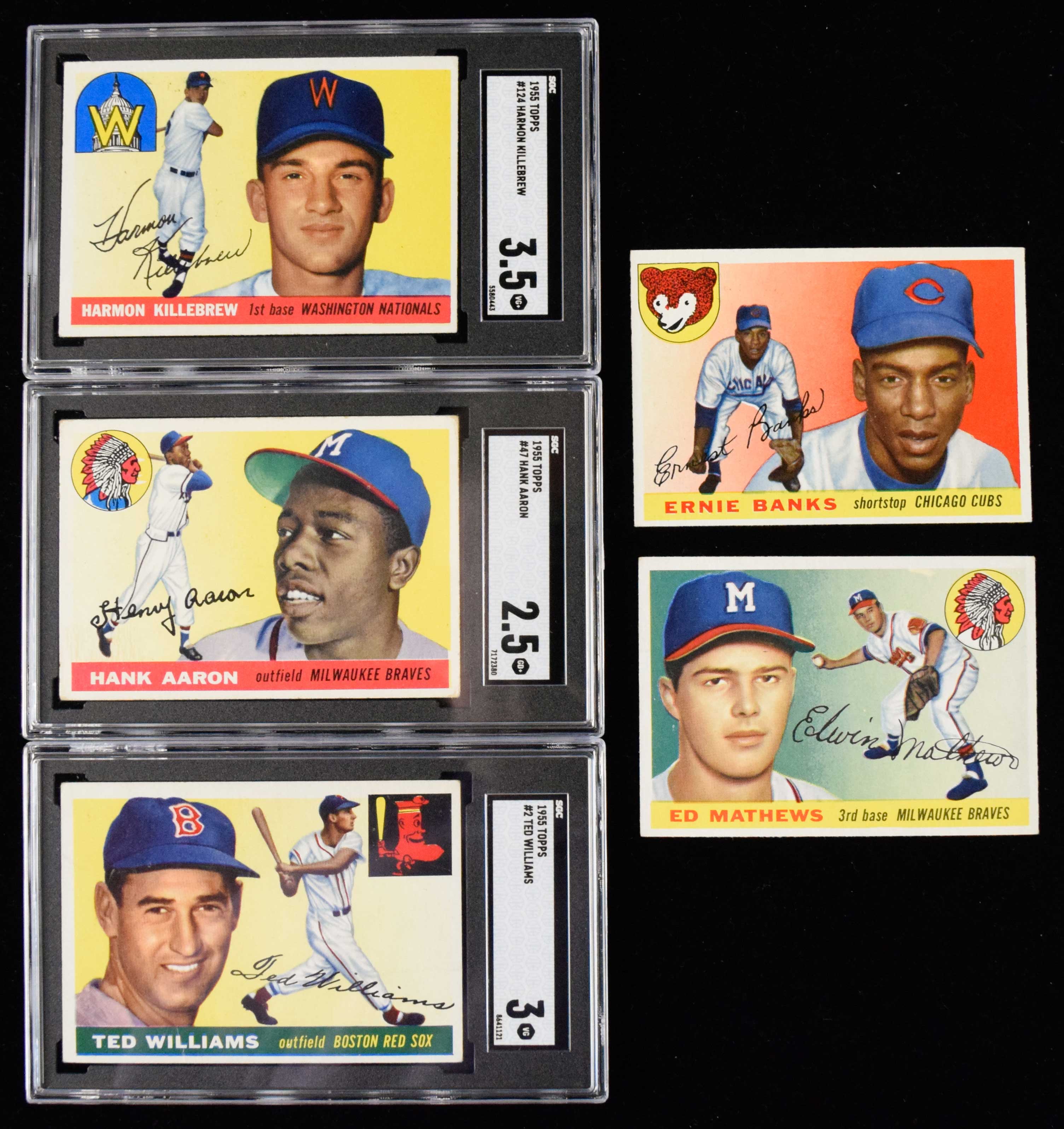1955 Topps Baseball near complete set (202 of 206 cards) (Avg. VG-VG/EX) Average VG-VG/EX condition with GD-EX general range. Keys: #2 Williams (SGC 3 VG), 4 Kaline (VG), 28 Banks (VG), 31 Spahn (EX), 47 Aaron (SGC 2.5 GD+), 100 Irvin (EX), 120 Kluszewski (EX-EX/MT), 124 Killebrew (SGC 3.5 VG+), 155 Mathews (EX), 187 Hodges (VG), 189 Rizzuto (EX), 198 Berra (VG OC), and 210 Snider (VG OC). Missing #50 Robinson, 123 Koufax, 164 Clemente, and 194 Mays: Avg. VG-VG/EX ($1,000-$2,000)