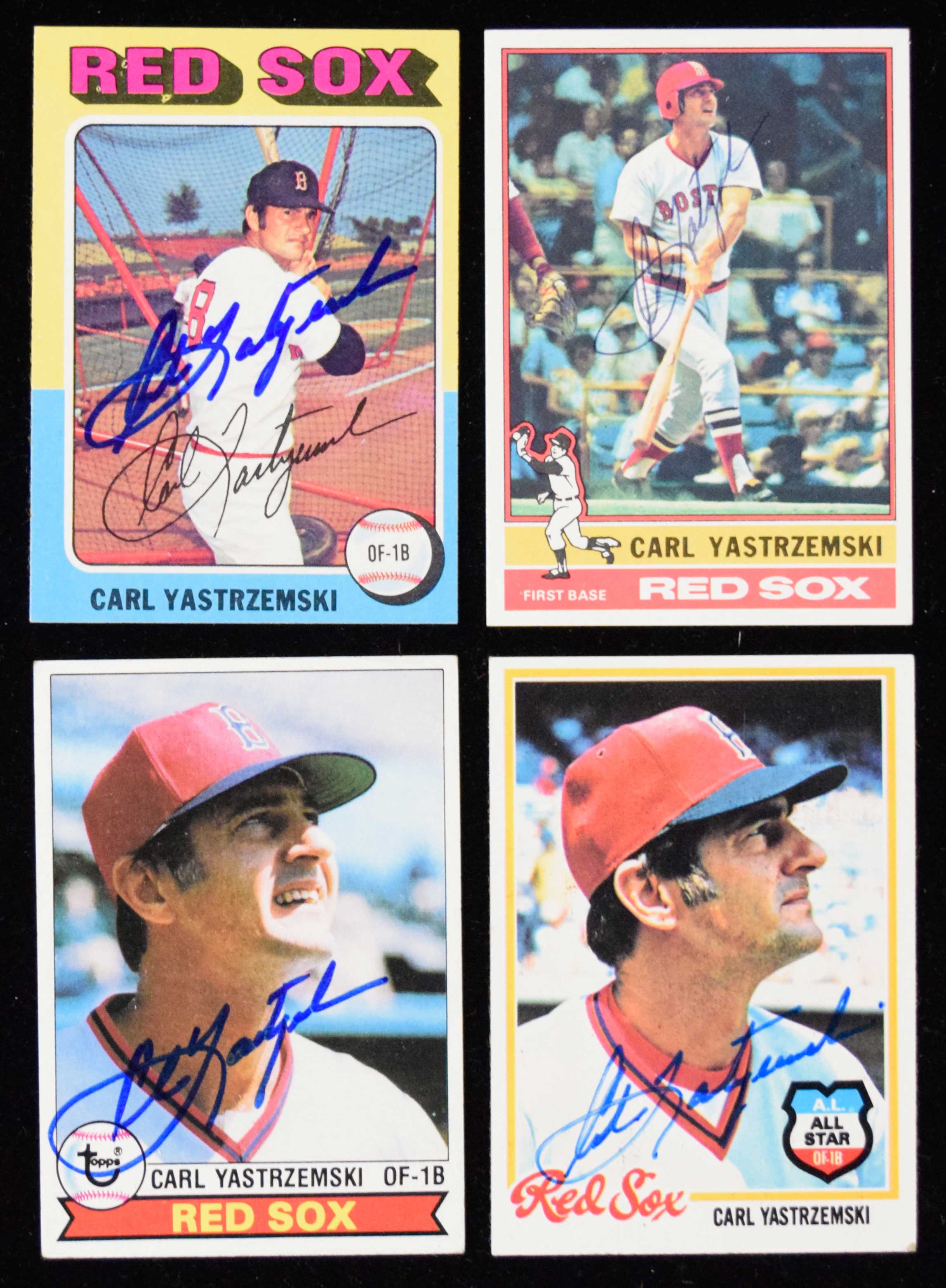 Carl Yastrzemski autographed 1975, 76, 78, and 79 Topps Baseball cards (Sigs. NM, Cards EX-NM) Signatures rate 8 to 9 out of 10. Touch of light scattered wear to cards: Sigs. NM, Cards VG-EX/MT