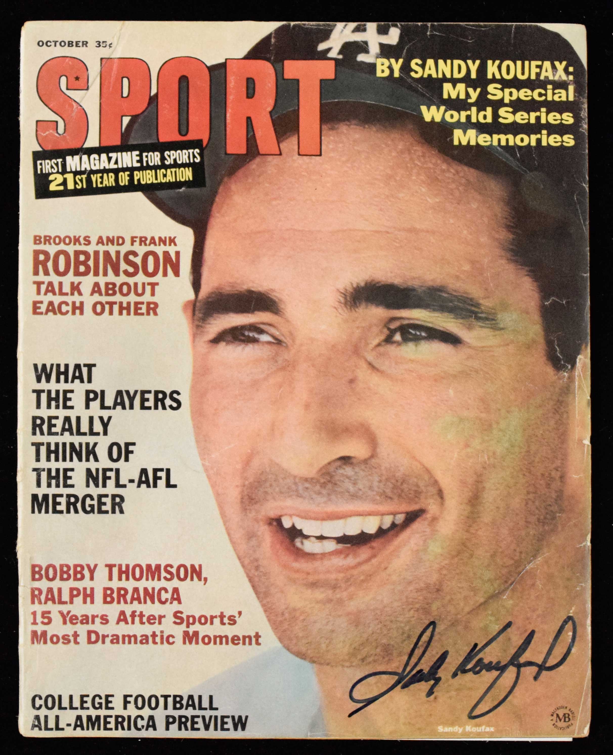 Description:Sandy Koufax autographed 1966 Sport Magazine (Sig. NM, Magazine VG) Signed in marker rating 9/10 out of 10. Moderate general handling and storage wear throughout: Sig. NM, Magazine VG