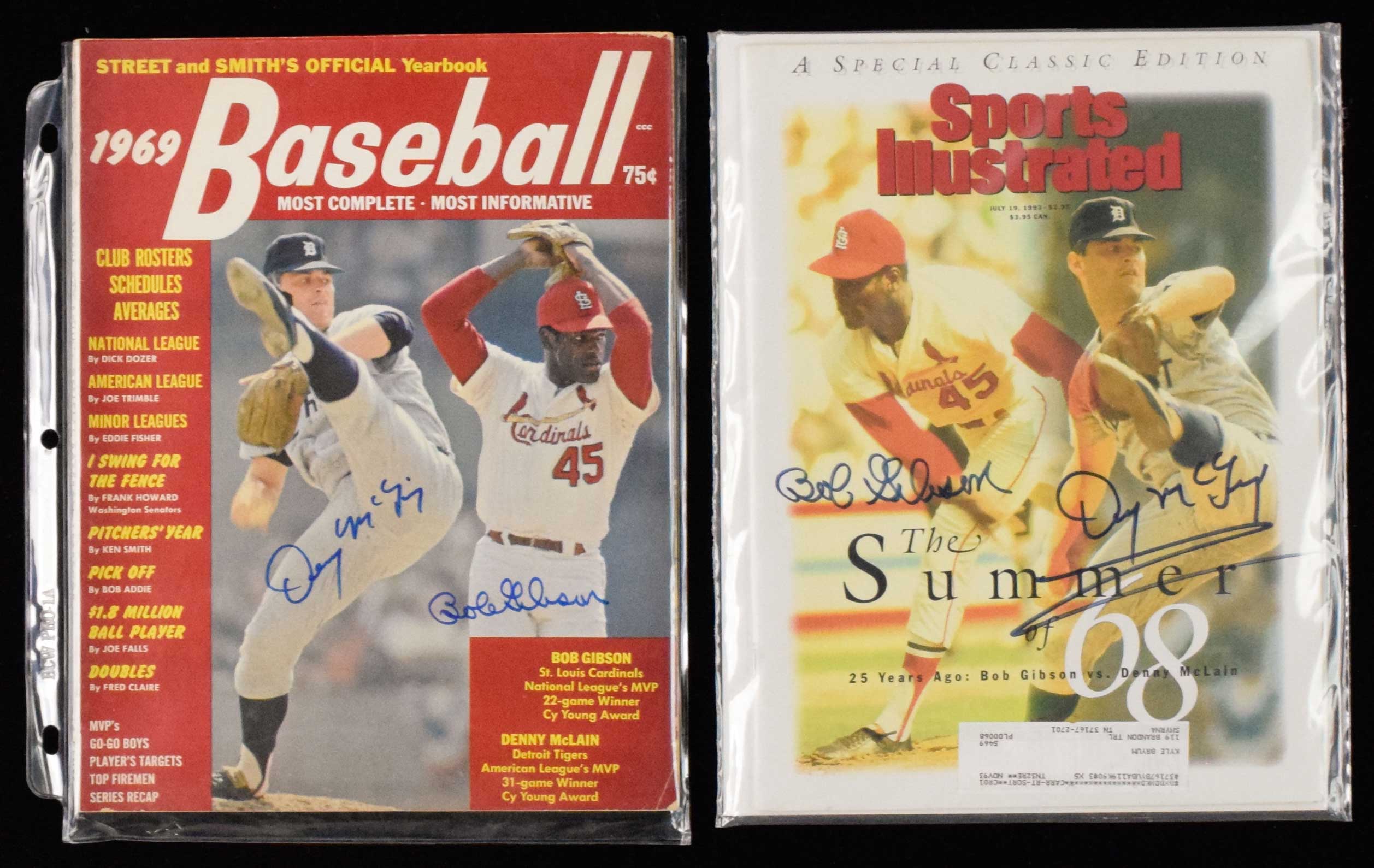 Description:Lot of (2) Bob Gibson and Denny McLain dual-signed magazines (Sigs. NM, Mags EX and NM) All autographs done in marker rating 9/10 out of 10. Street & Smith's 1969 issue has light handling wear, later Sports Illustrated is NM: Sigs. NM, Mags EX and NM