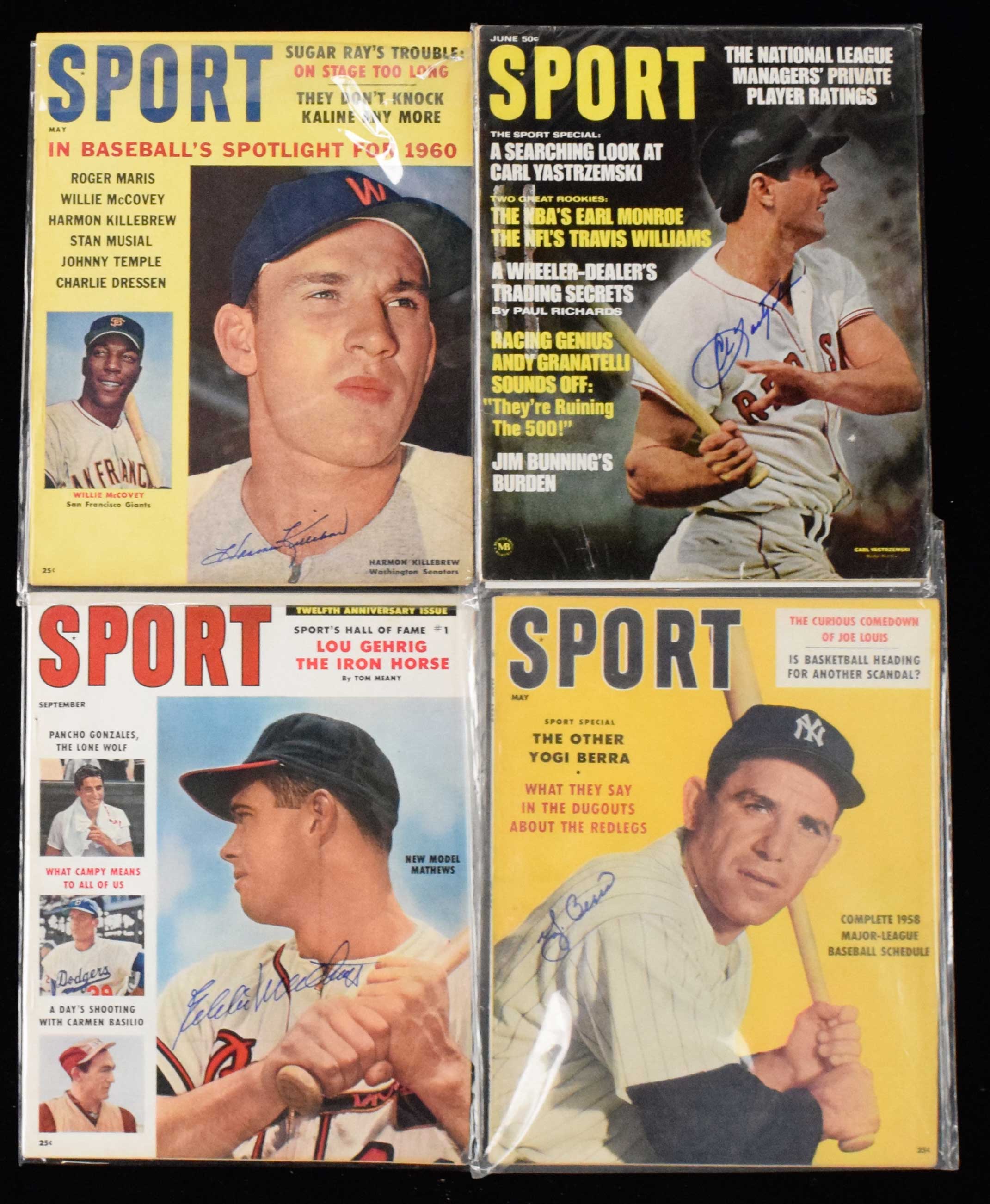 Description:Lot of (4) Hall of Famer autographed Sport Magazine issues (Sigs. NM, Mags VG-EX) Includes pieces signed by Yogi Berra, Eddie Mathews, Harmon Killebrew, and Carl Yastrzemski. Marker signatures rate 8 to 9 out of 10. Light to mild general handling and storage wear: Sigs. NM, Mags VG-EX