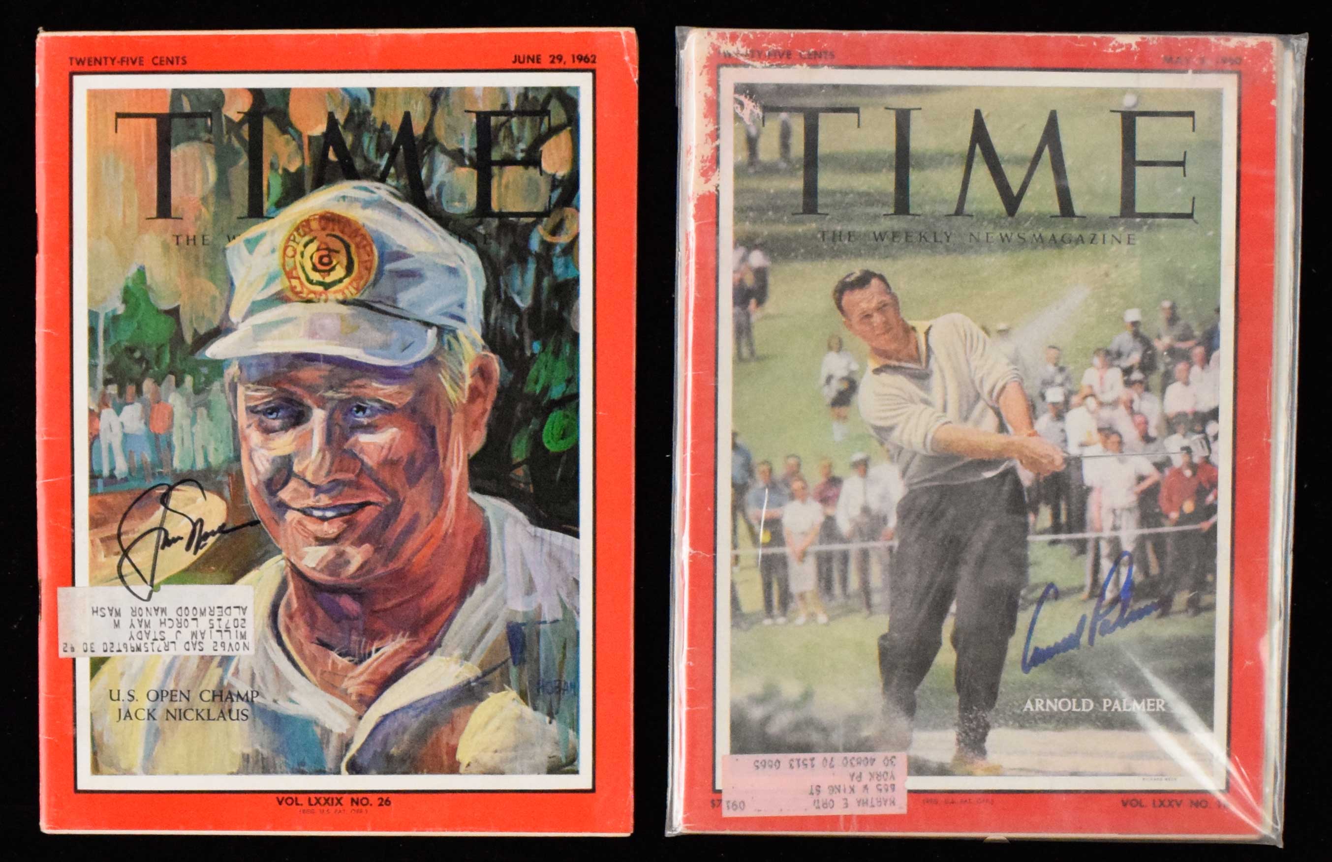 Description:Arnold Palmer and Jack Nicklaus autographed Time Magazine issues (Sigs. NM) Each signed in marker rating 9/10 out of 10. The Nicklaus piece has light/mild general handling wear, Palmer has some more pronounced damage along the top edge: Sigs. NM