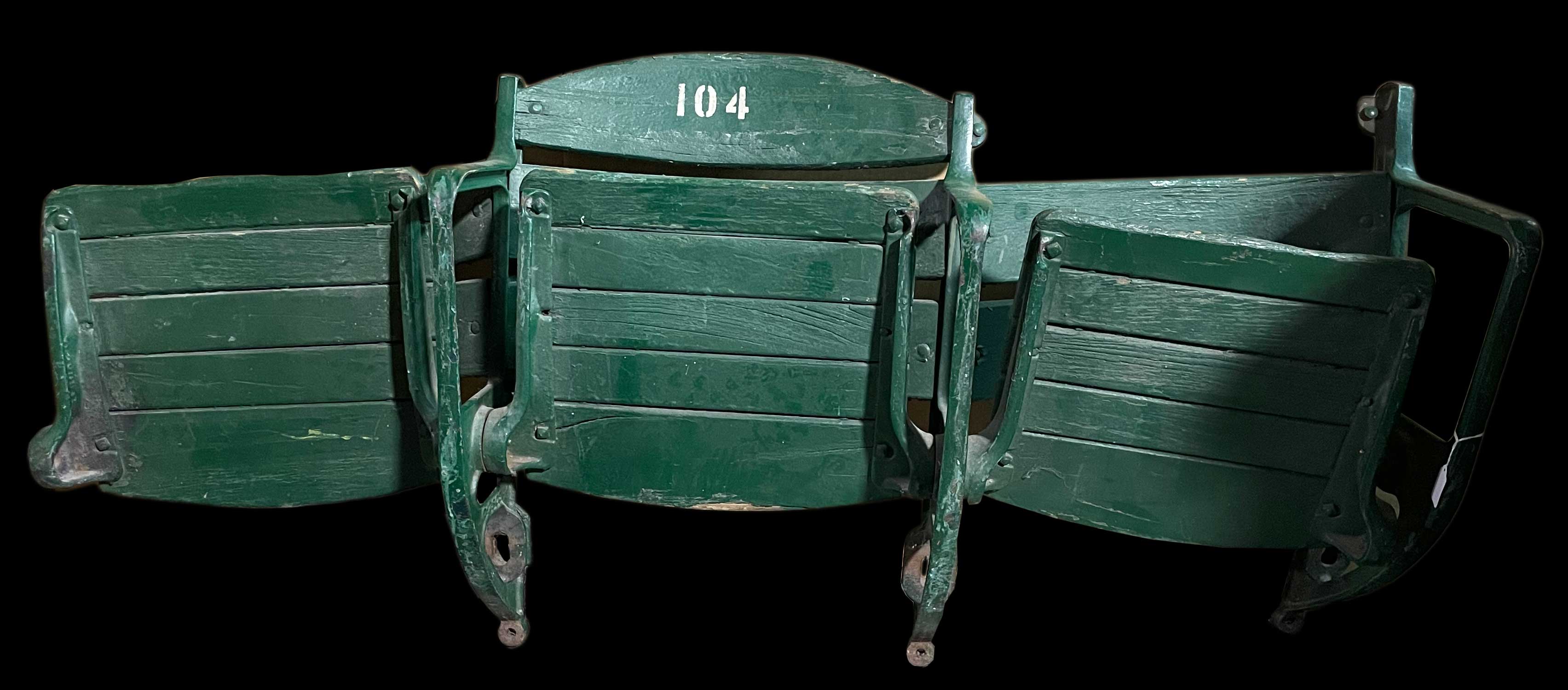 Description:Wrigley Field vintage cast iron and wood stadium seats (see description) Portions of a row of (3) Wrigley Field vintage stadium seats includes one in the center which is complete. Those on either end are missing slats of wood and the seat on one side is missing the side stanchion. Wear throughout as expected given use as intended. Please note - one or two "complete" connected seats could likely be formed from the parts however an upper slat would need to be replaced: see description