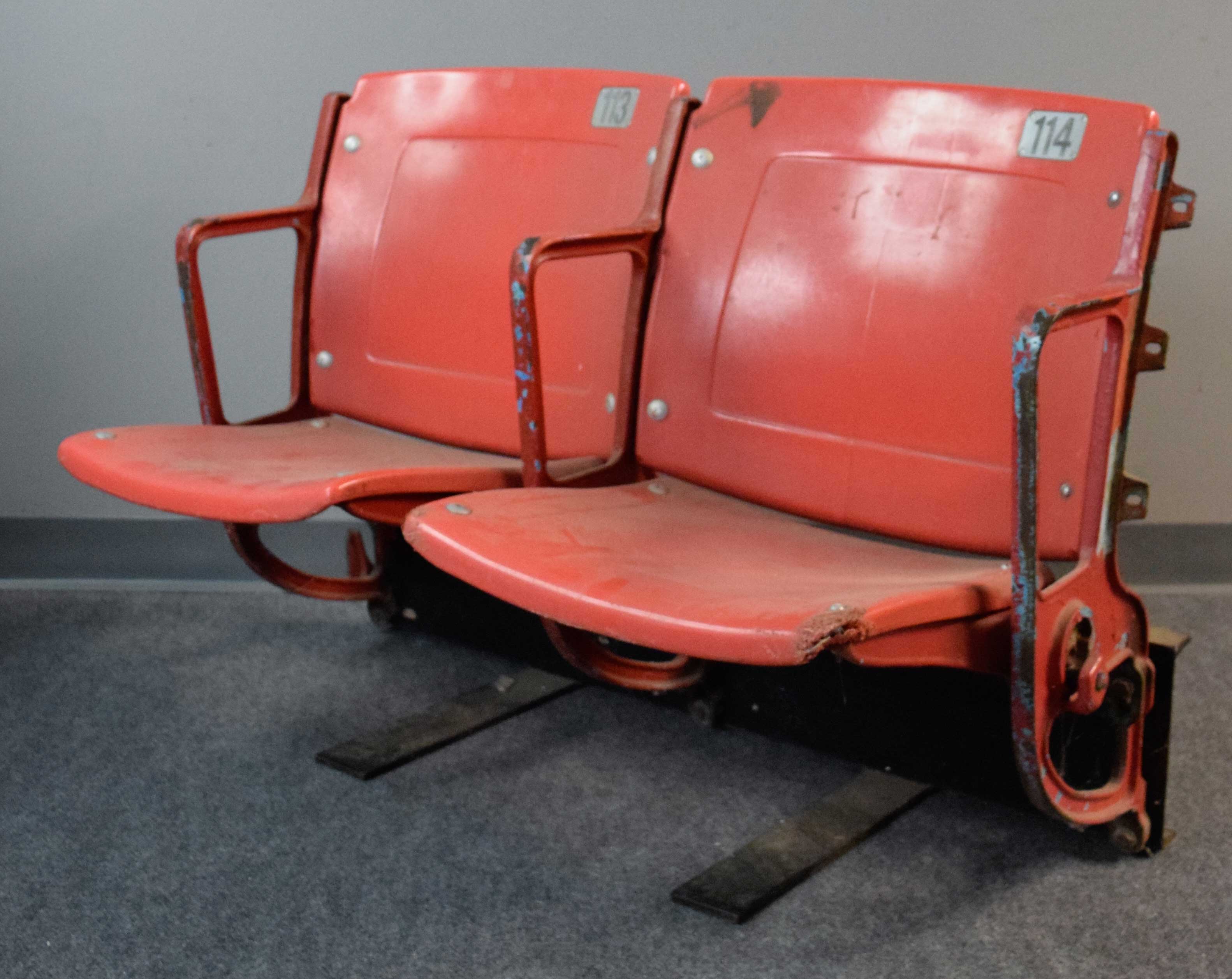 Description:Atlanta-Fulton County Stadium attributed seats (connected pair) (VG-EX) Pair of cast iron and plastic seats are free standing on included cast iron rebar mount (very heavy). Wear throughout as expected given long term use as expected and there is some chipping to the plastic on one seat bottom: EX