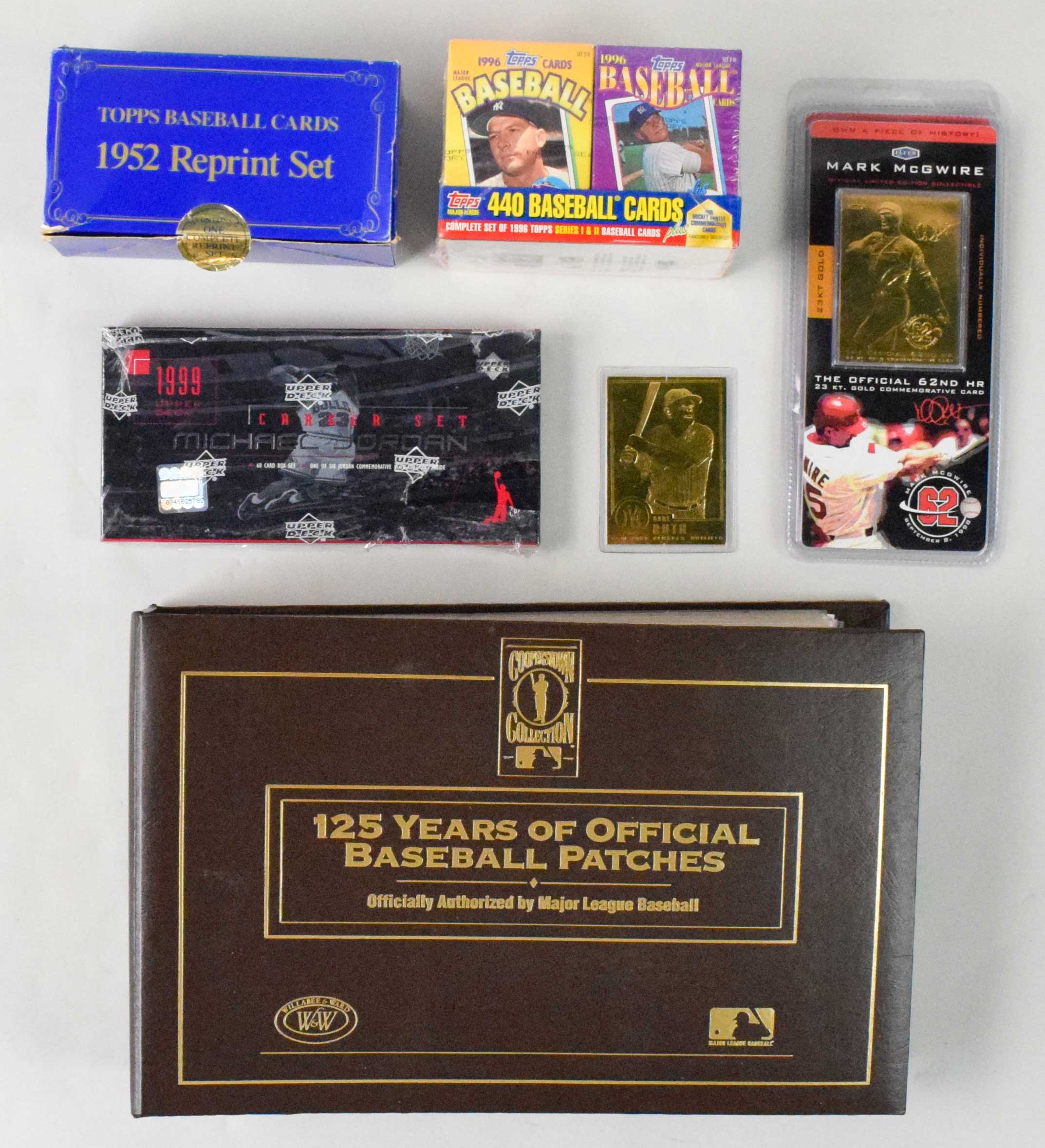 Description:Interesting lot of mixed modern sports cards and others (mostly baseball) (VG-NM) Includes 1952 Topps reprint set; 1953 Topps Archives set; Willabee & Ward set of baseball reproduction patches in original binder; (2) 1999 Upper Deck Michael Jordan Career Sets (both in original box, one completely sealed, the other with a few holes in the shrik wrap); (10) Mark McGwire Fleer 62nd homerun commemorative cards in original packaging; 1989 Topps Traded Football set; 1999 Fleer Tradition Update set; 1996 Topps Baseball complete factory set in cereal style boxes; 1992 Topps Baseball micro set; 1999 Topps Baseball Traded set; (2) sizable boxes of assorted 1980s-2000s sportscards (most appear to be baseball); some star cards; and others. Fills (4) small to medium sized boxes. Varying degrees/types of wear throughout with some sets/pieces sealed as issued and others which have been opened: VG-NM