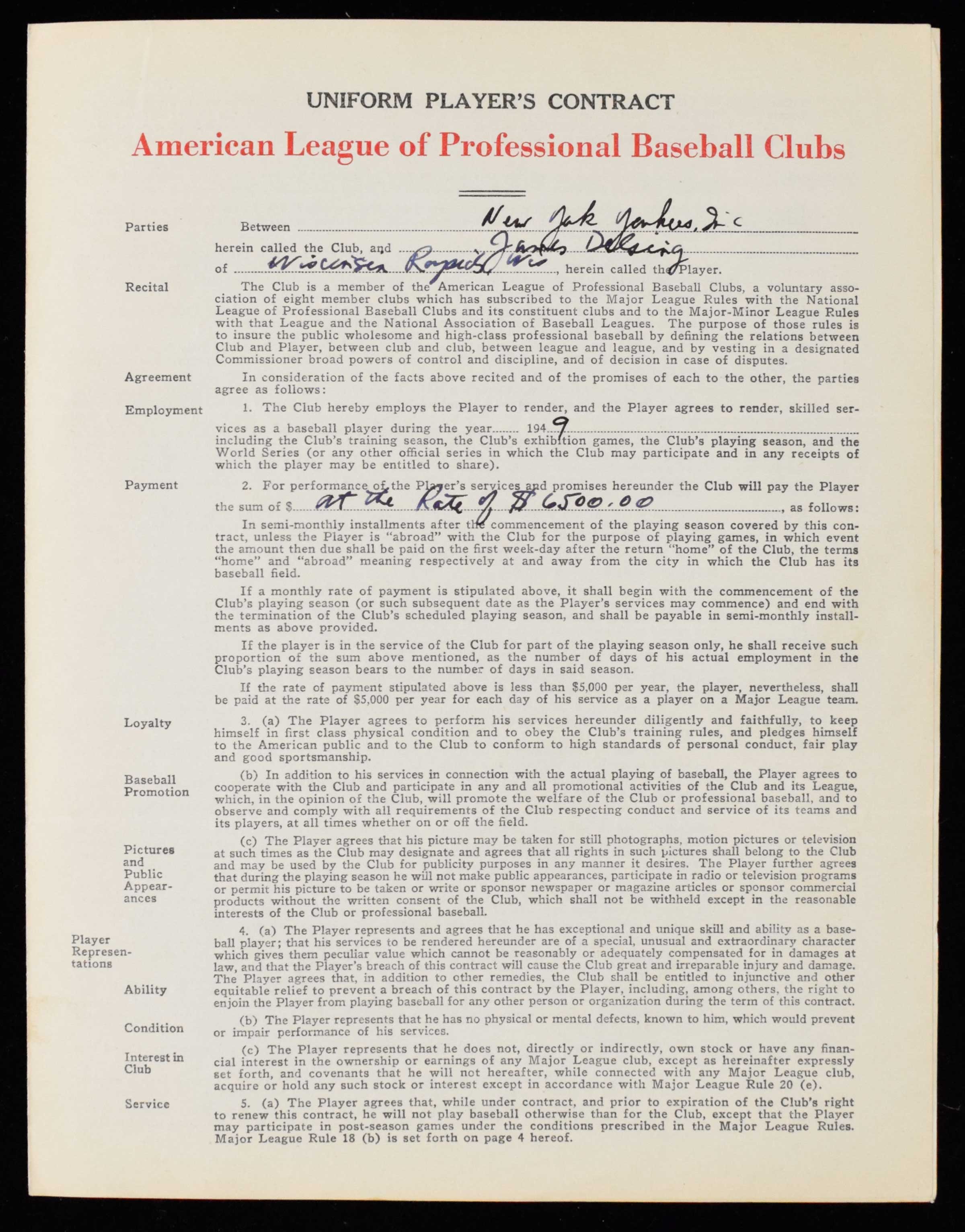 Description:1949 Jim Delsing New York Yankees contract signed by Harridge and Weiss (EX-NM) Standard uniform player's contract has been signed inside by Jim Delsing, William Harridge, and George Weiss. All are done in fountain pen rating 7/8 to 9/10 out of 10. Typical mailing folds and a hint of light toning/wear: EX-NM