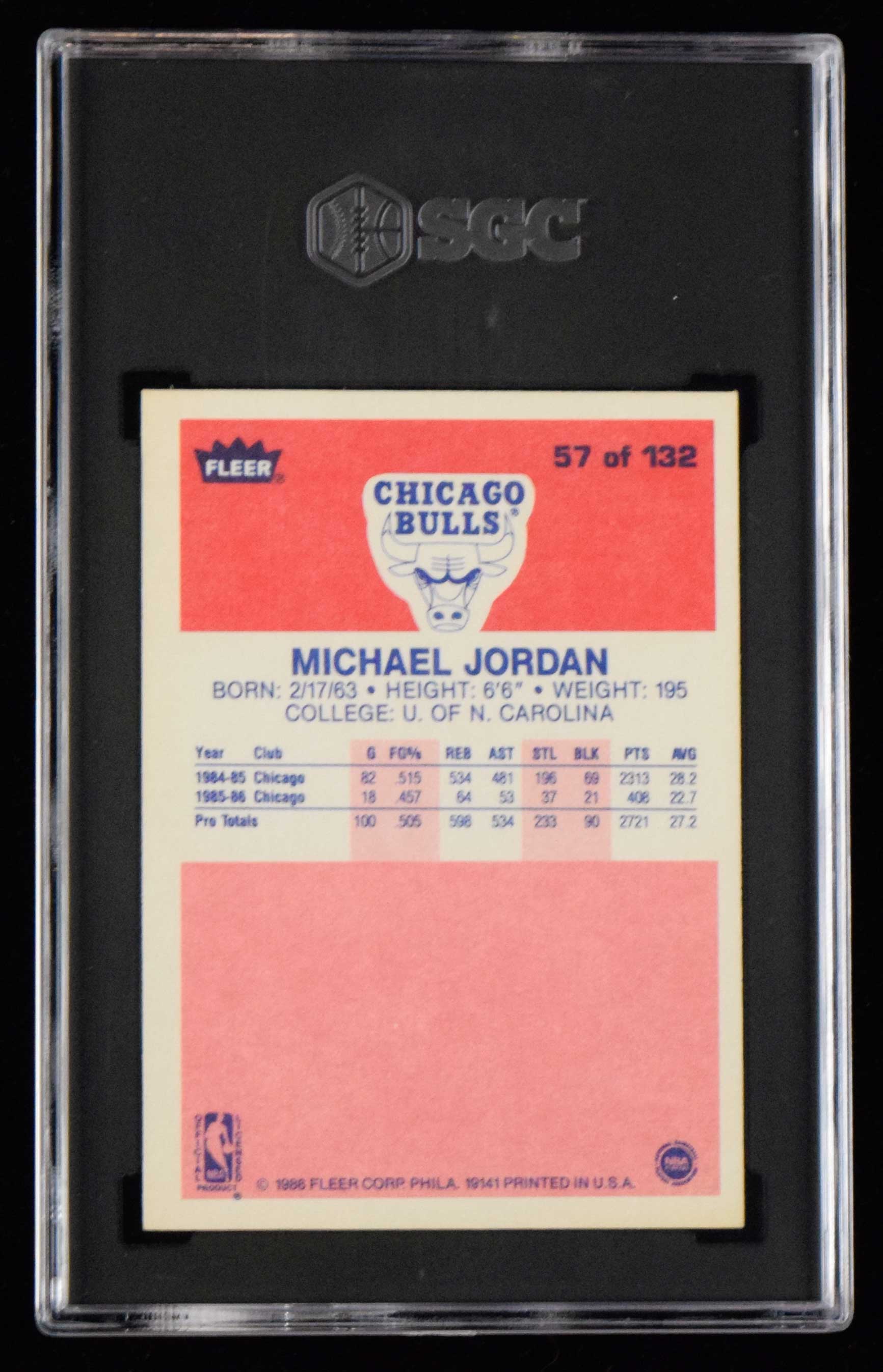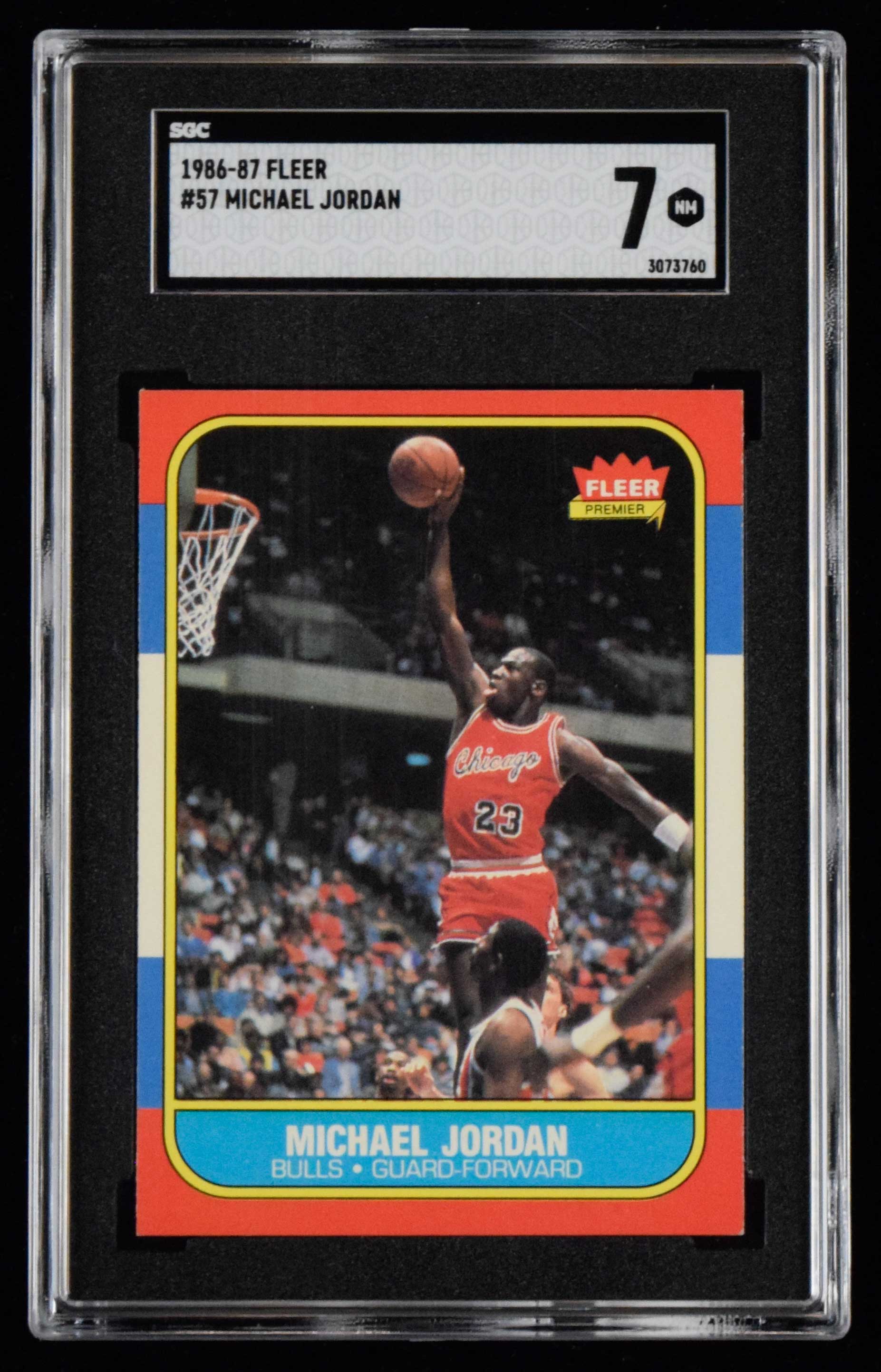 Description:1986-87 Fleer #57 Michael Jordan Rookie (SGC 7 NM) High grade "pack fresh" card with the slightest touch to corners/edges and centering which very slightly favors the left edge: SGC 7 NM ($3,000-$5,000)