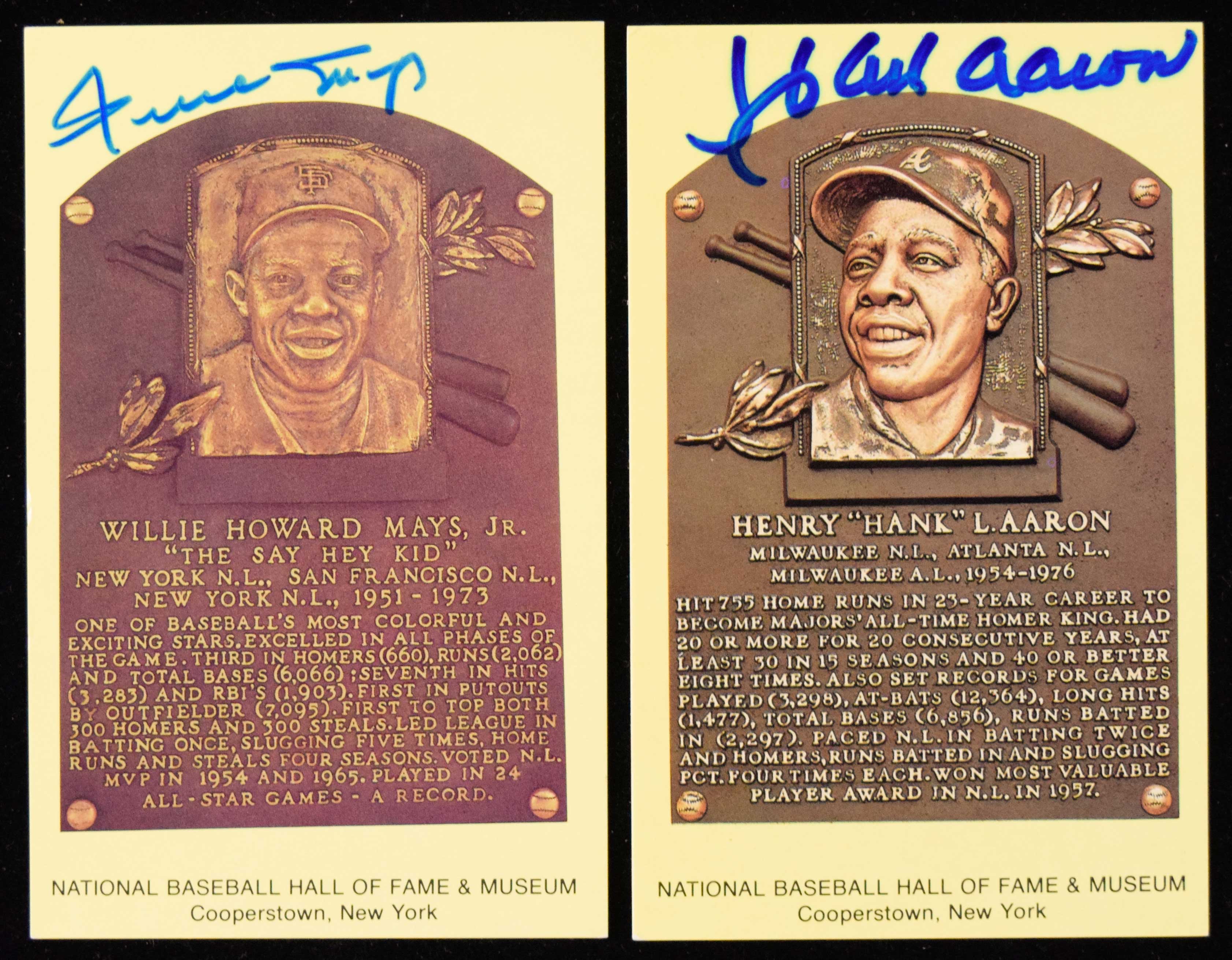 Description:Hank Aaron and Willie Mays autographed Yellow Hall of Fame postcards (Sigs. NM, Postcards EX/MT-NM) Each signed in marker rating 8/9 out of 10: Sigs. NM, Postcards EX/MT-NM