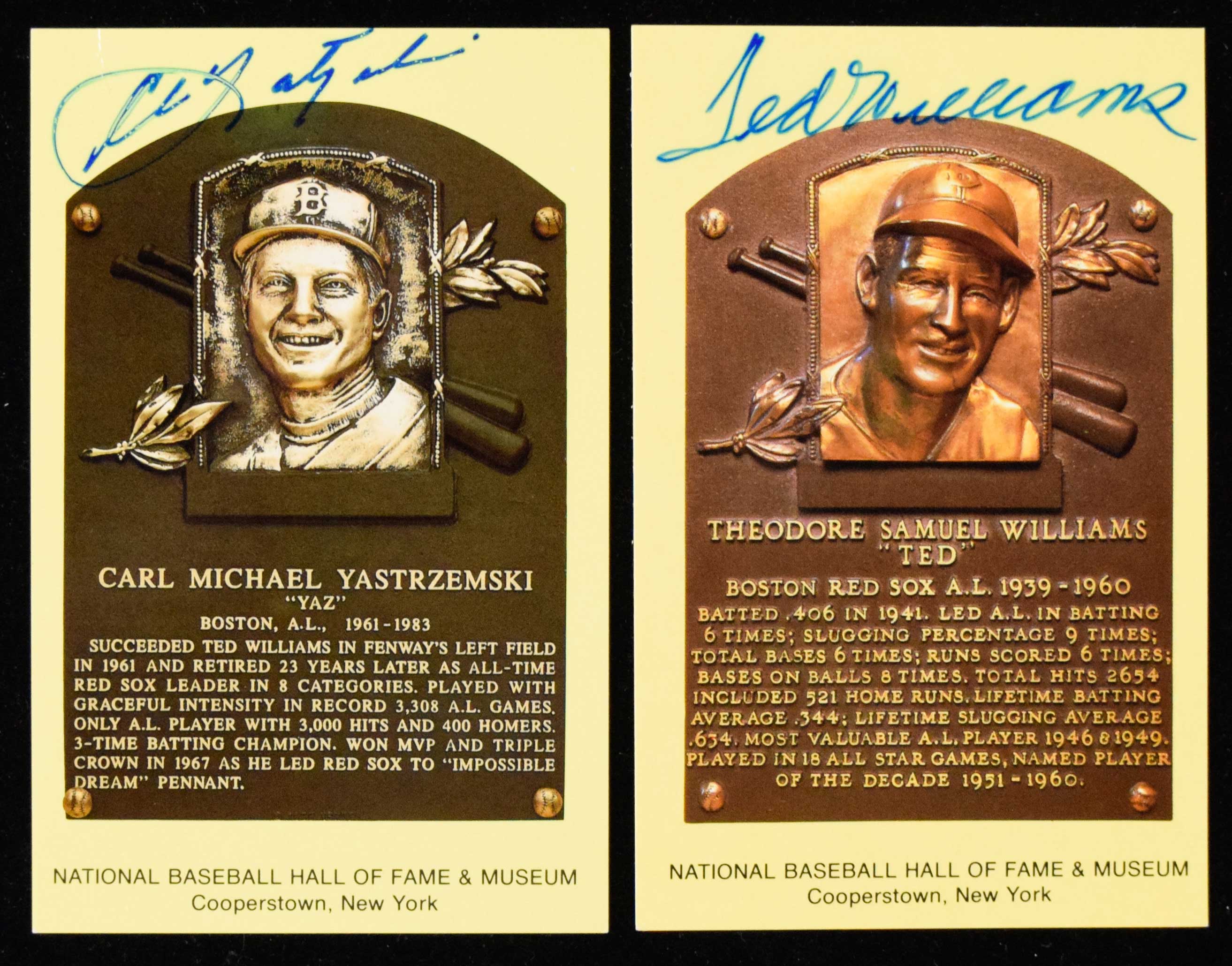 Description:Ted Williams and Carl Yastrzemski autographed Yellow Hall of Fame postcards (Sigs. NM, Postcards EX-NM) Each signed in marker rating 8/9 out of 10. Yaz postcard has a crease: Sigs. NM, Postcards EX-NM