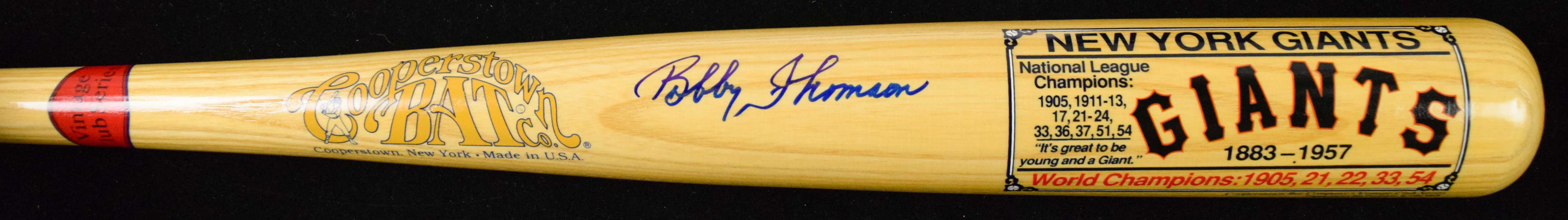 Description:Bobby Thomson autographed New York Giants commemorative bat (NM) Cooperstown Bat Co. bat with commemorative logo on the barrel has been signed in marker rating 9/10 out of 10: NM