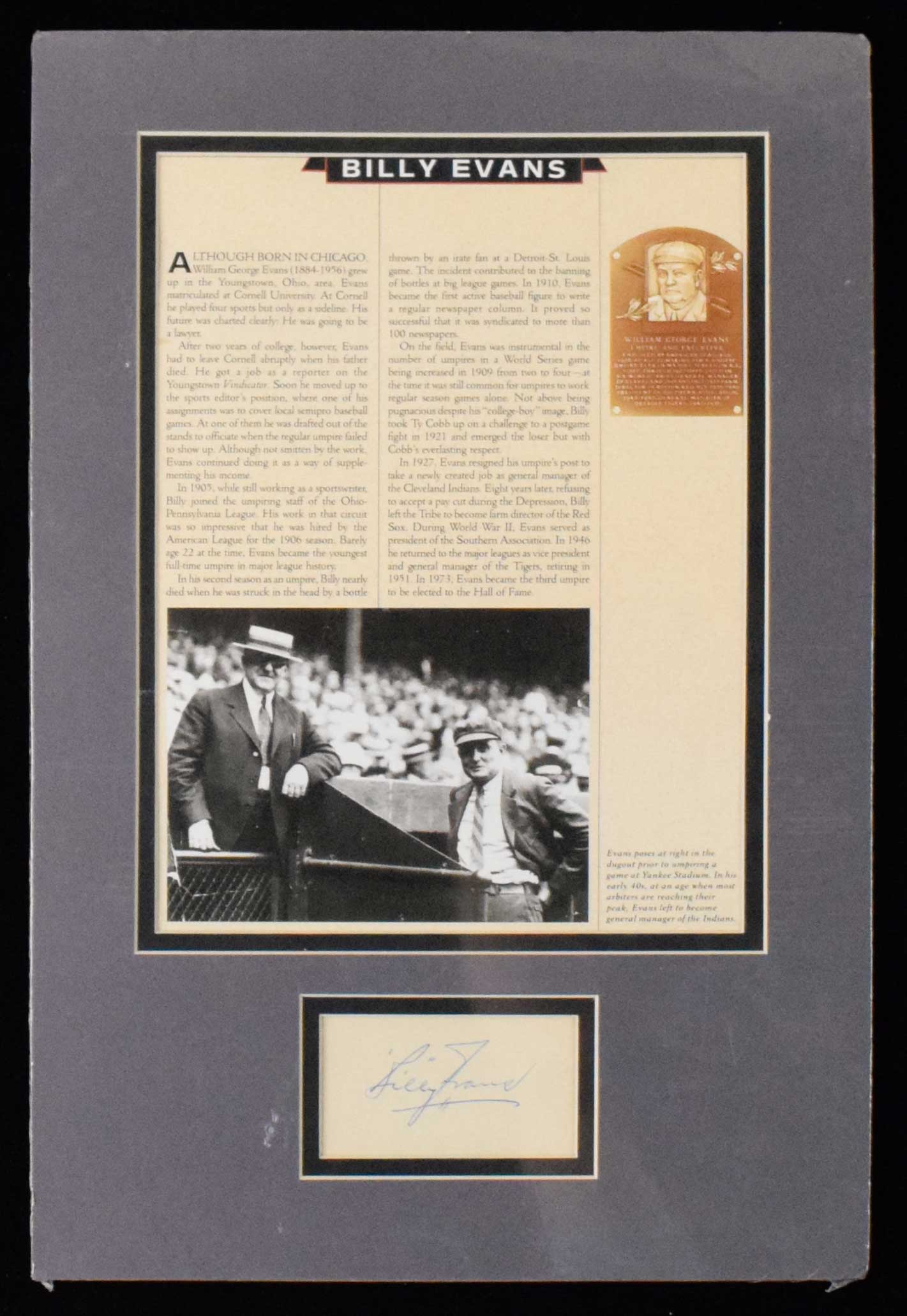 Description:Billy Evans autograph (Sig. EX/MT-NM) Ink signature rating 7/8 out of 10 appears on lightly toned slip of paper which has been matted to 11.75"x17.5" for display (some very minor bends in matting): Sig. EX/MT-NM