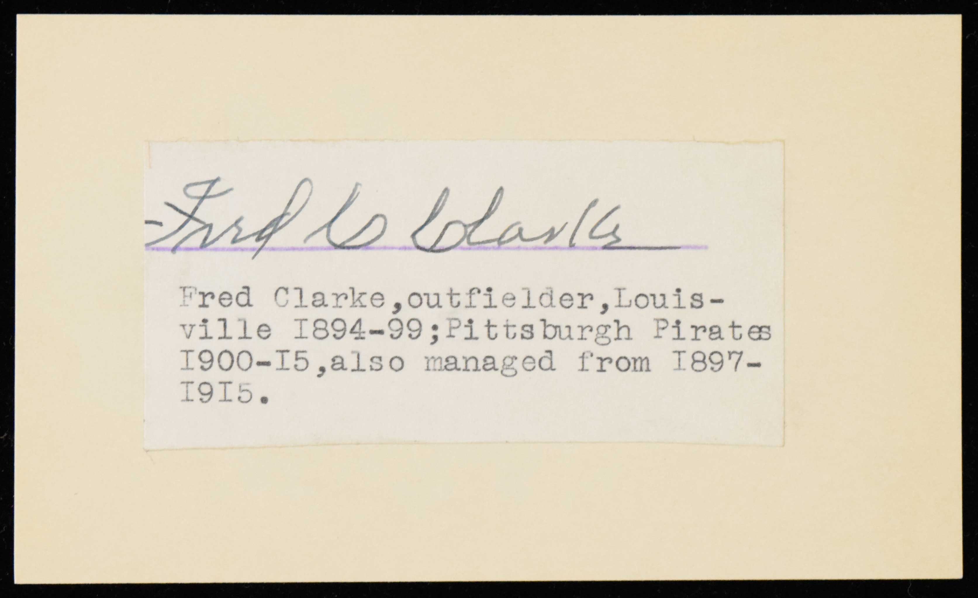 Description:Fred Clarke autograph (Sig. NM) Vintage ink signature rating 8-8/9 out of 10 appears on a small slip of paper which has been mounted to index card. A very small portion of the "F" is missing: Sig. NM