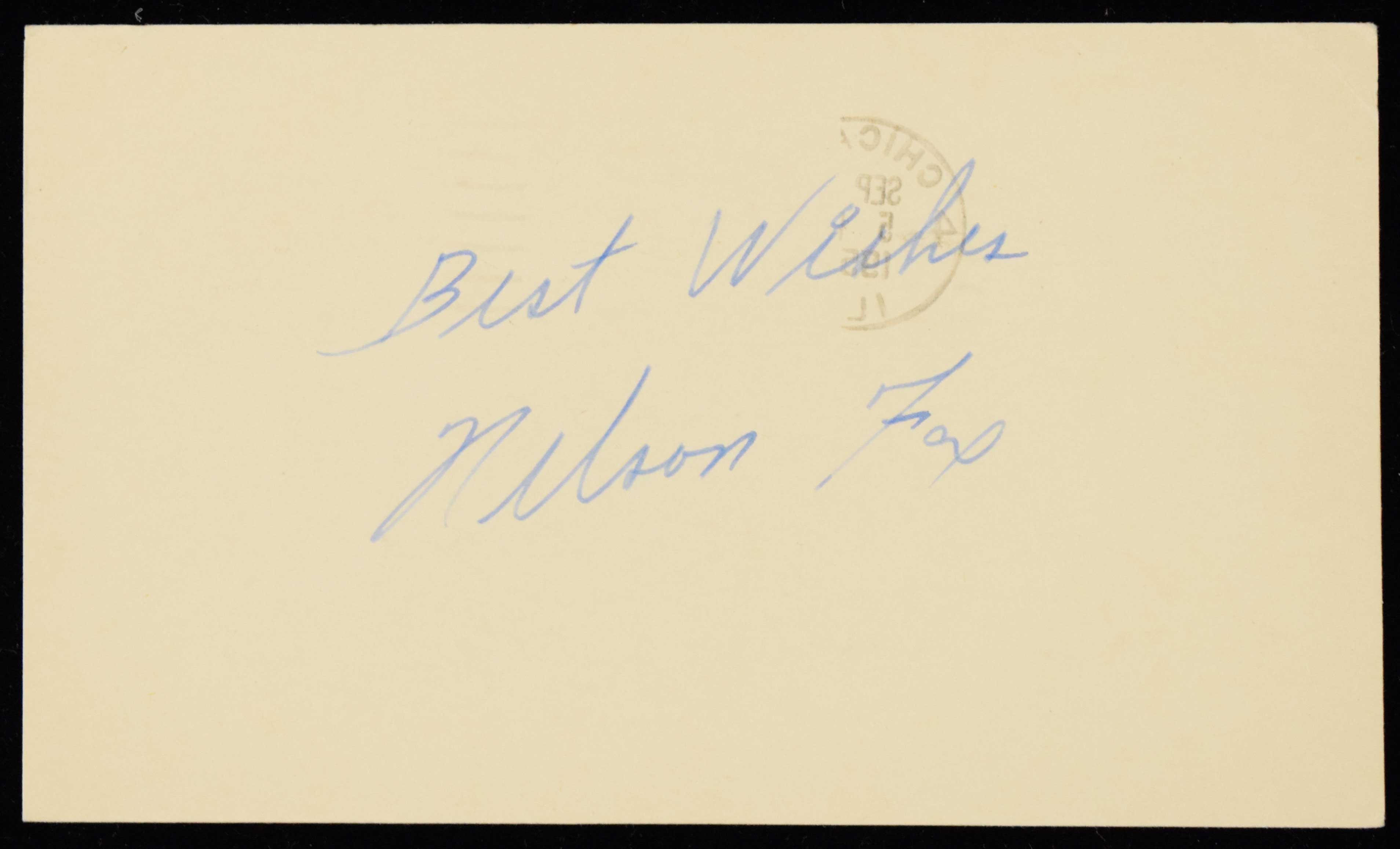 Description:1956 Nelson Fox autographed Government postcard (Sig. NM) Signed in vintage ink rating 8 out of 10 and postmarked 1956 from Chicago. Light toning and a touch of wear: Sig. NM