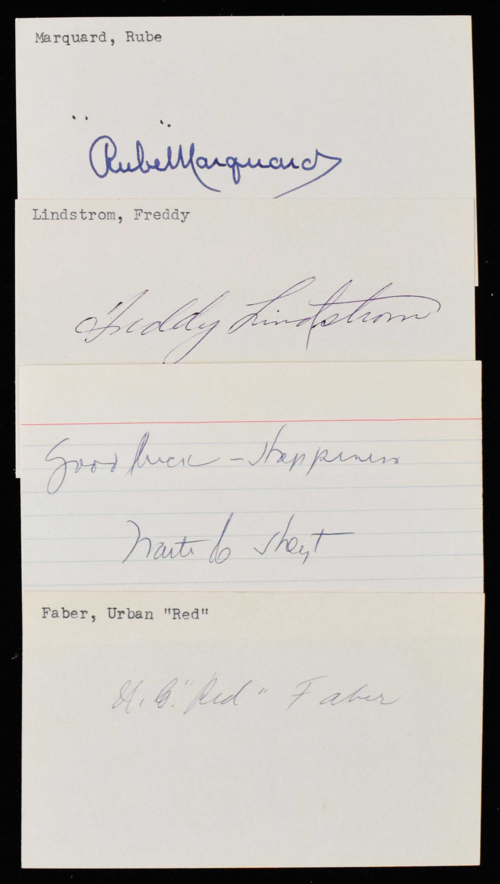 Description:Lot of (8) Hall of Famer signed index cards (Sigs. NM) Includes Fred Lindstrom, Rube Marquard, Sam Rice, Red Faber, Chick Hafey, Joe McCarthy, Waite Hoyt, and Bucky Harris. Each signed in ink rating 7 to 9 out of 10: Sigs. NM