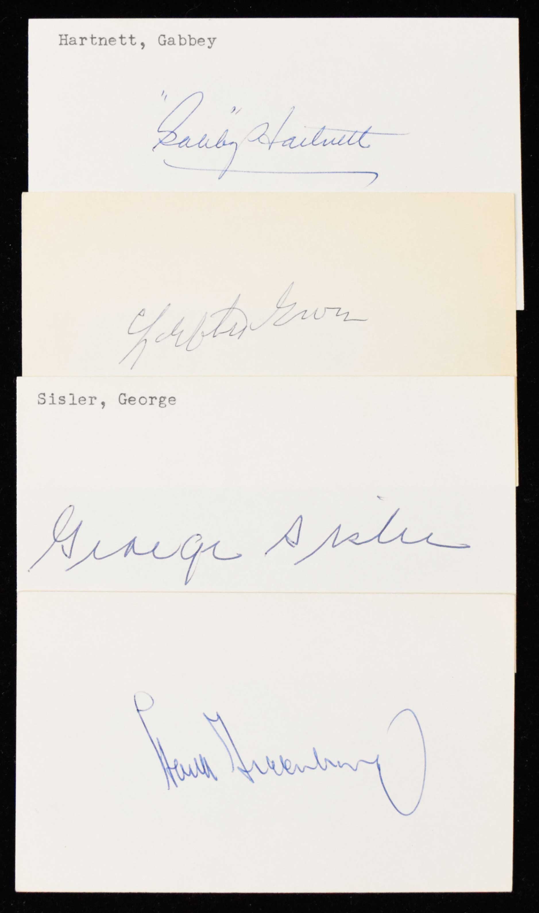 Description:Lot of (4) Hall of Famer signed index cards (Sigs. NM) Includes George Sisler, Hank Greenberg, Lefty Grove, and Gabby Hartnett. Signatures rate 7/8 to 8 out of 10: Sigs. NM