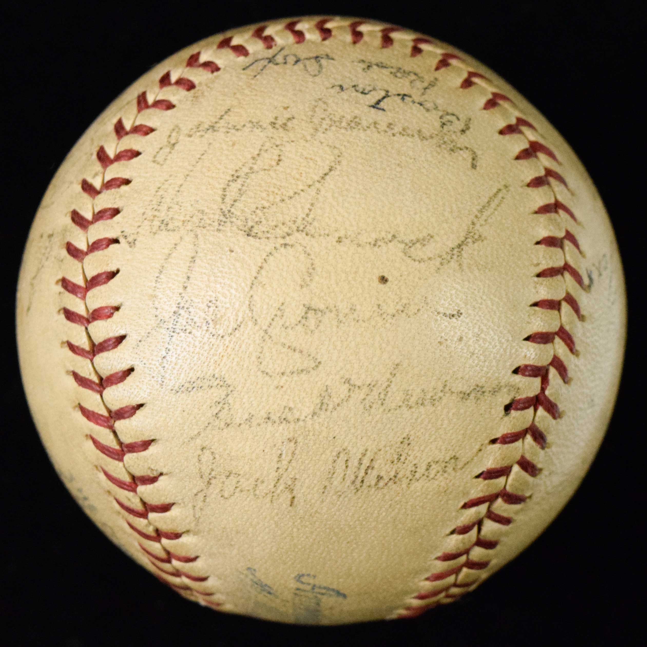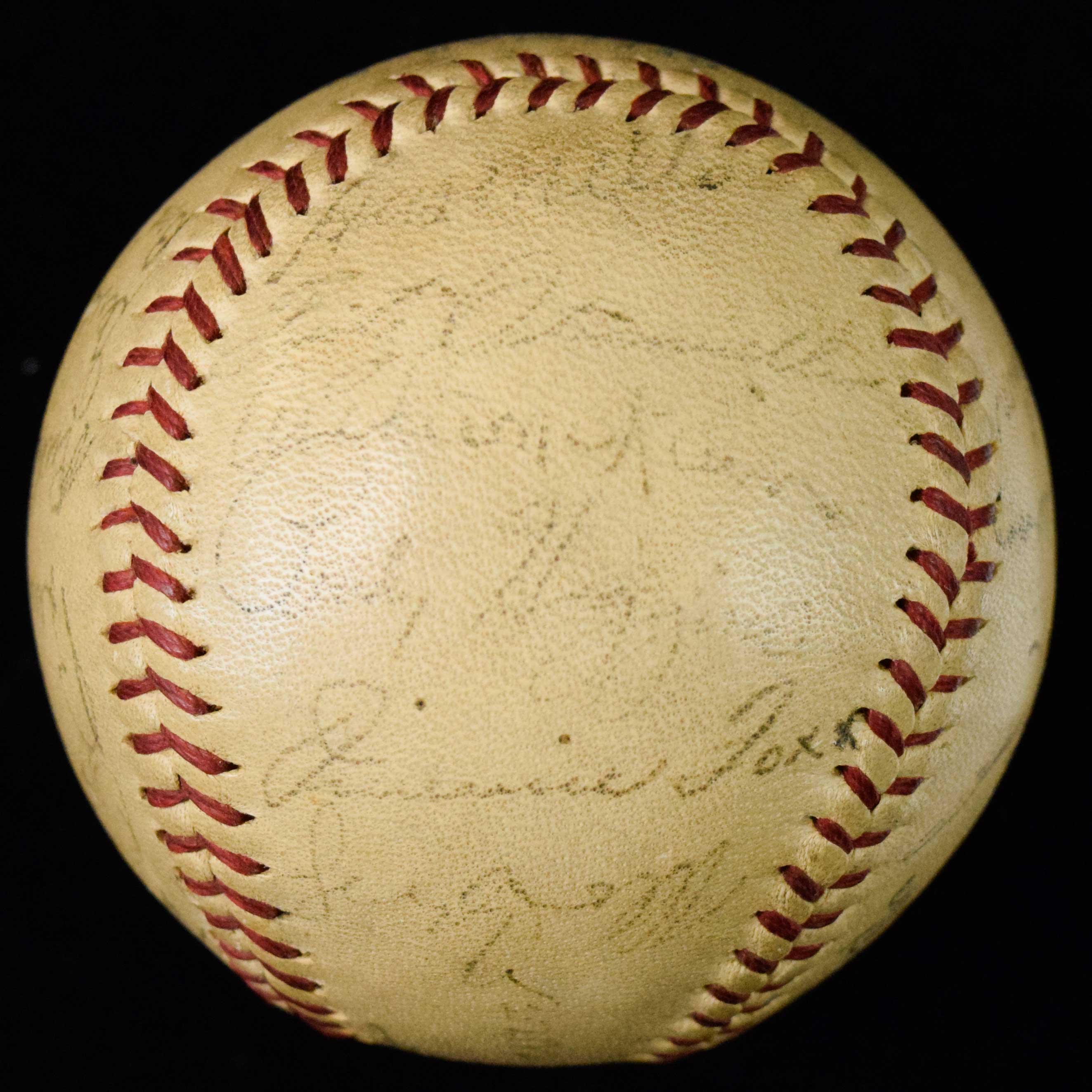 Description:1937 Boston Red Sox team signed baseball with Jimmie Foxx (VG-EX) Reach W.Harridge Official American League baseball has been signed by (22) incl. Jimmie Foxx, Lefty Grove, Moe Berg, Joe Cronin, Herb Pennock, Bobby Doerr, Bing Miller, Rube Walberg, Eric McNair, Pinky Higgins, and others. All are done in fountain pen rating 5 to 6/7 out of 10 (there may be one or two lighter). Mild even toning. Includes 2009 dated auction LOA from JSA: VG-EX ($750-$1,250)
