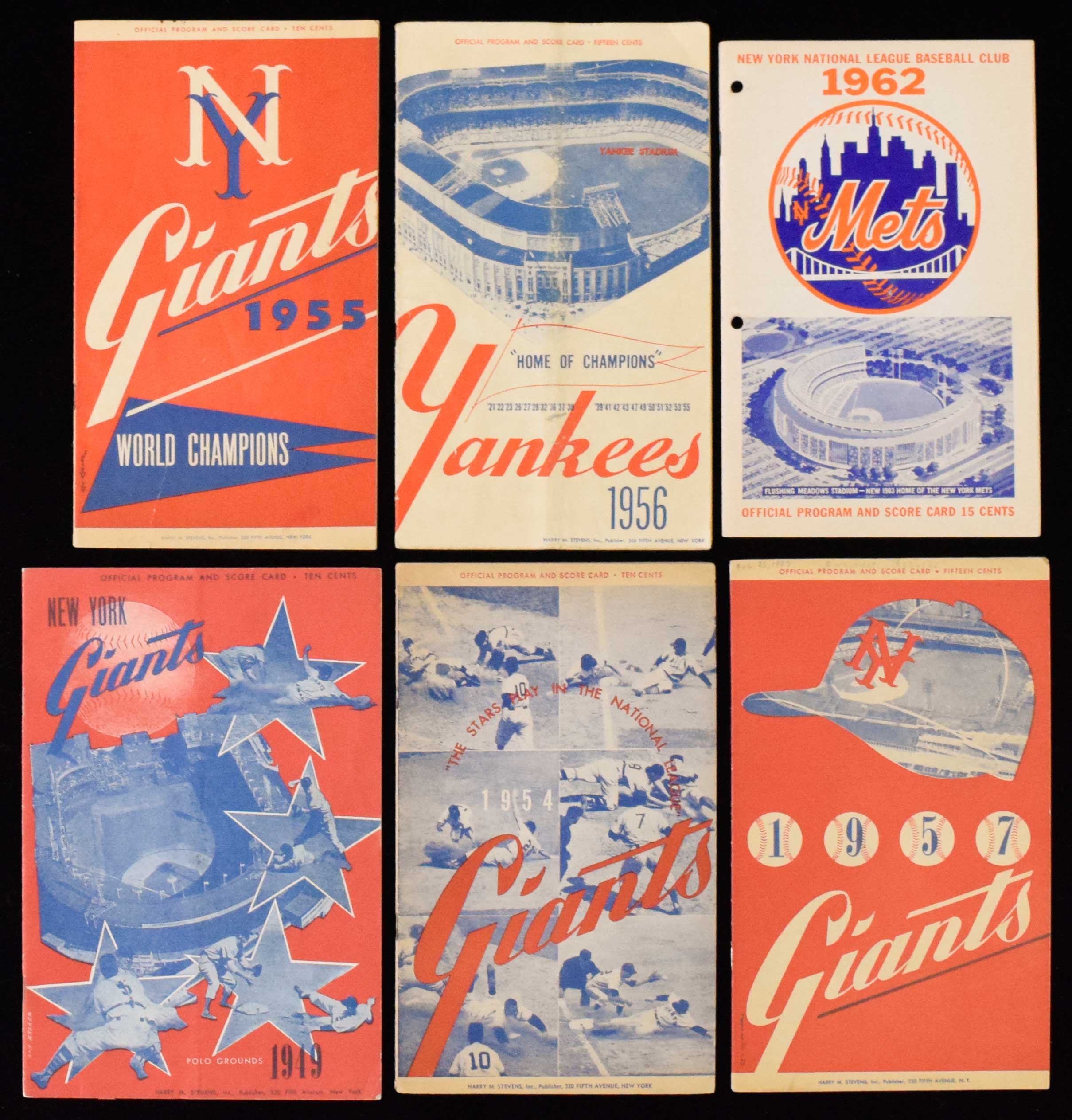 Description:Lot of (11) 1949-1962 New York Giants, Mets, and Yankees scorecards (FR/GD-EX) Includes (9) New York Giants scorecards incl. 1949, 1950 (moisture damage on cover, ticket stub tucked inside), 1951, 1952, 1953, 1954, 1955, 1956, and 1957; 1962 Mets scorecard vs. Cubs with Ernie Banks noted as hitting a homerun (holes punched along bound edge); and 1956 Yankees scorecard (FR/GD). Varying degrees/types of wear throughout with most pieces around EX unless noted. Some scored: FR/GD-EX