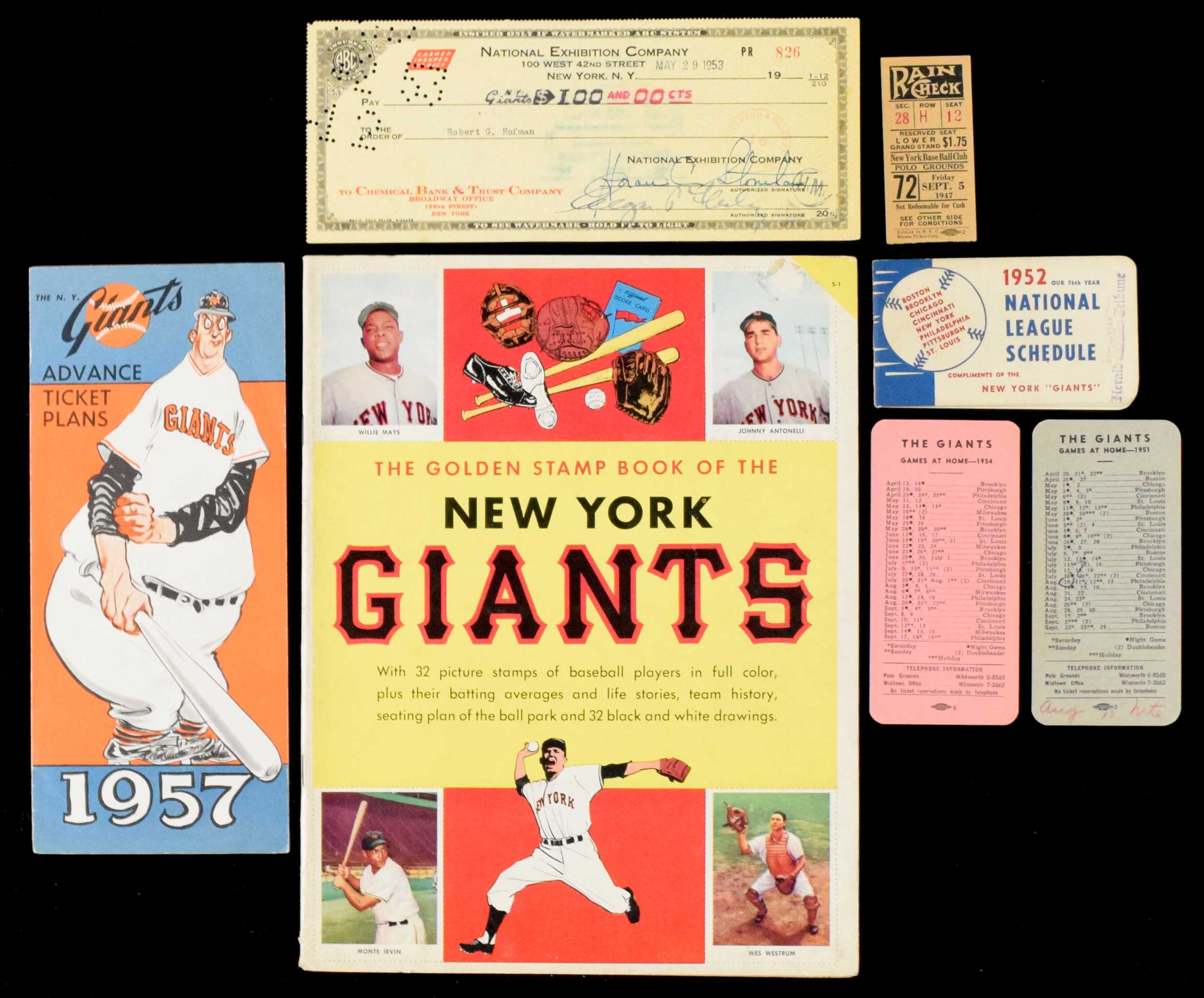 Description:New York Giants ephemera including 1947 ticket stub vs. Brooklyn Dodgers (FR-EX) Includes 1953 dated check written to player Bob Hofman which is signed by Horace Stoneham on front and Hofman on back; 1955 Golden Stamp Book of the Giants (stamps remain in sheet form as issued); "Playing The Giants Game" promotional booklet; 1951 Giants yearbook (paper loss on upper front cover); 1957 Giants advance ticket plan brochure; 1955 letter on Giants stationary regarding tickets; 1954 Giants pocket schedule; 1952 National League schedule booklet with "Courtesy of the New York Giants" printed on front; 1951 New York Giants admission coupon; original Giants ticket envelope which contains (3) June 28, 1951 Giants ticket stubs, (2) 1951 Giants pocket schedules, and some related Giants ticket paperwork; Sept. 5, 1947 Giants vs. Dodgers ticket stub. Varying degrees/types of wear throughout with most notable flaws mentioned above. Other pieces generally fall around EX: FR-EX