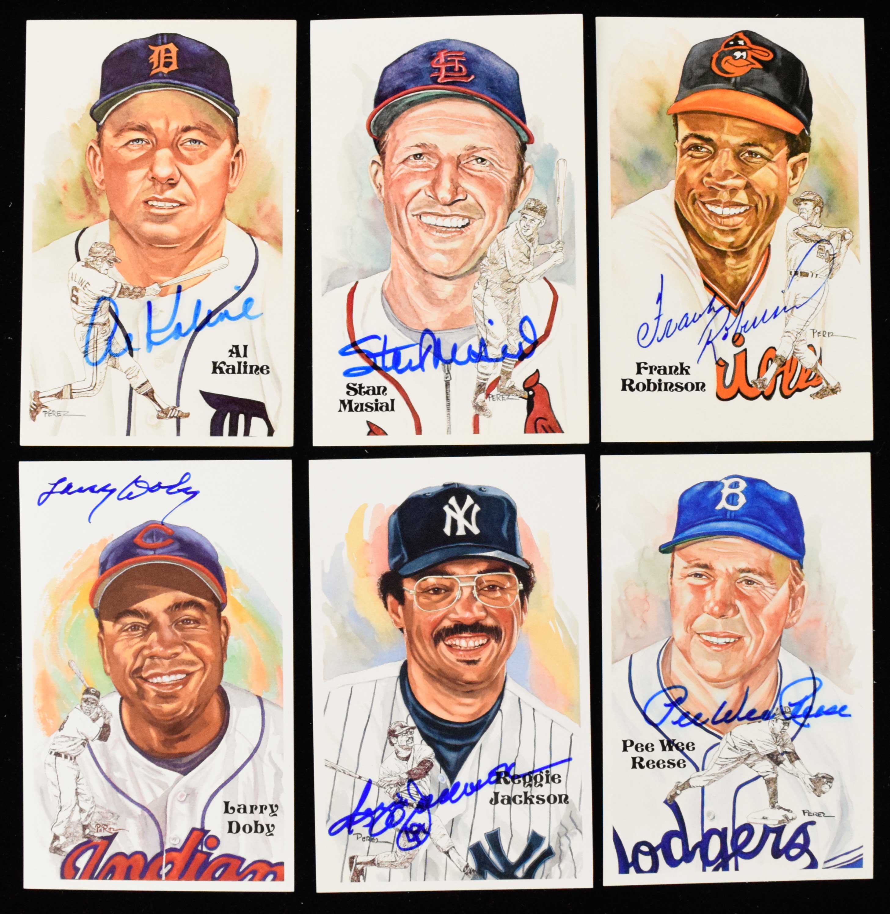 Description:Lot of (13) Hall of Famer signed Perez-Steele postcards (NM) Includes Reggie Jackson, Frank Robinson, Stan Musial, Pee Wee Reese, Duke Snider, Al Kainle, Harmon Killebrew, Willie McCovey, Orlando Cepeda, Larry Doby, Tony Perez, Joe Morgan, and Eddie Mathews. Marker signatures generally rate 8 out of 10 or better: NM
