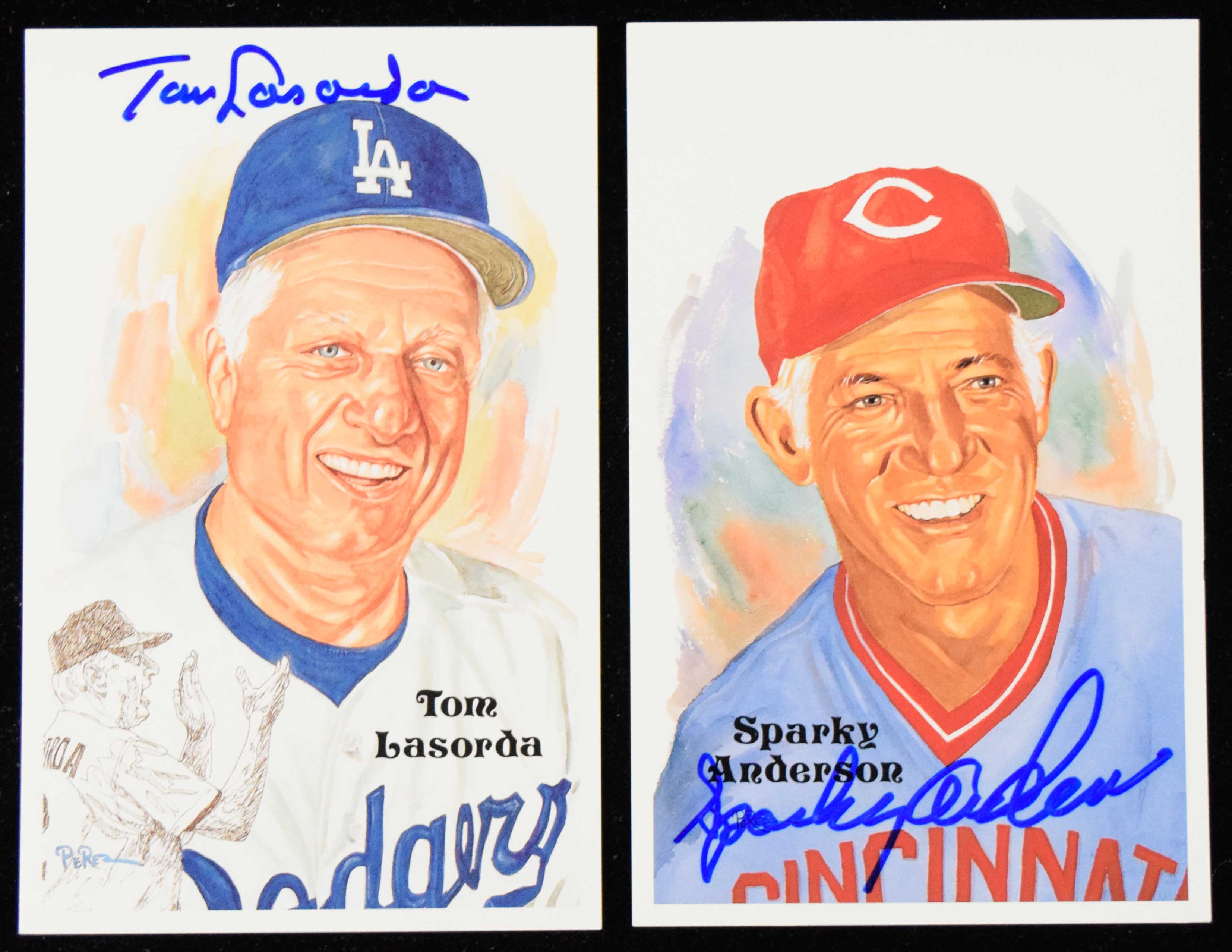 Sparky Anderson and Tom Lasorda signed Perez-Steele postcards (NM) Signed in marker rating 9/10 out of 10: NM