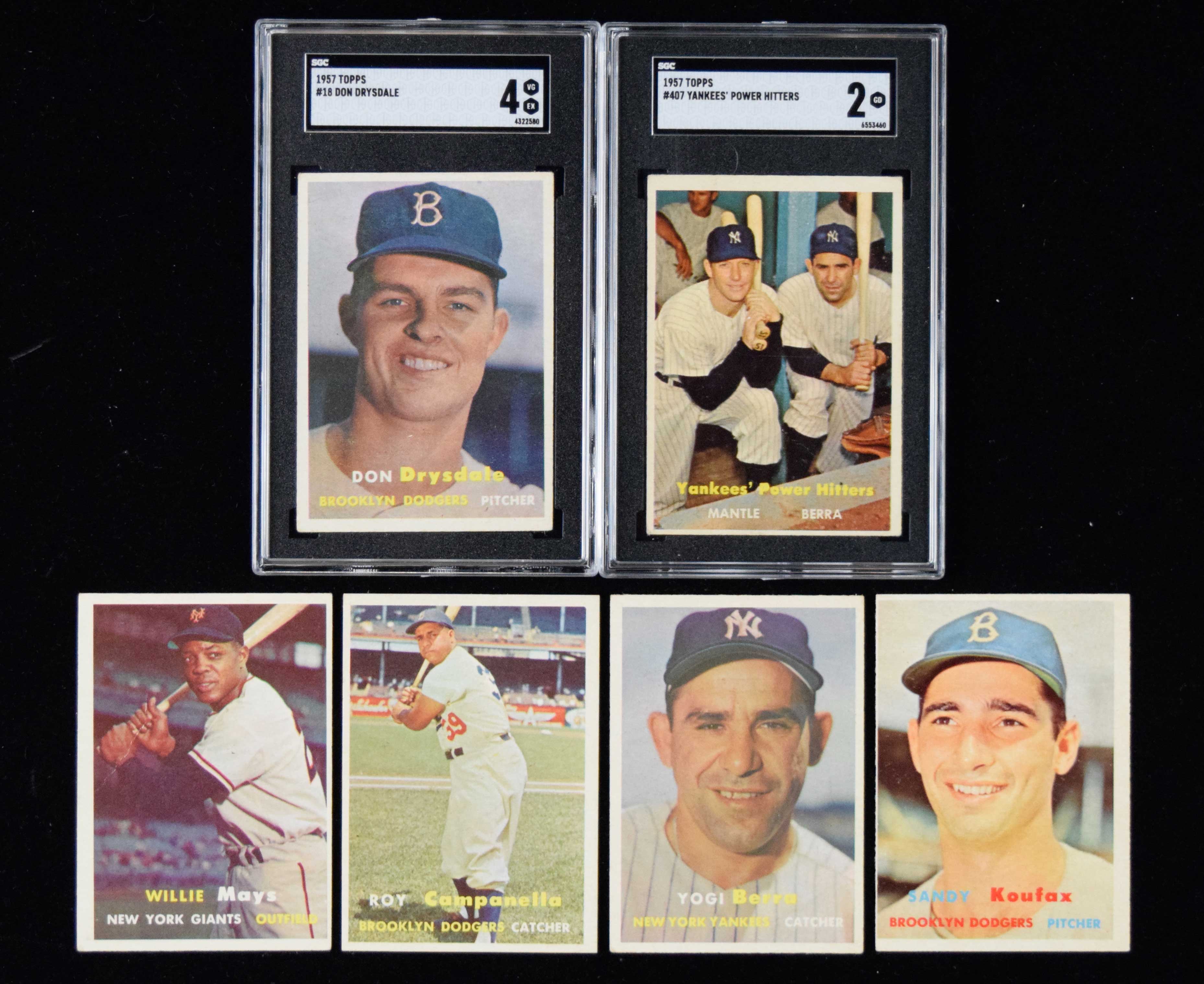 1957 Topps Baseball near complete set (400 of 407 cards) (Avg. VG) Average VG condition with GD-VG/EX general range. Keys: #2 Berra (VG), 10 Mays (GD), 18 Drysdale (SGC 4 VG EX), 24 Mazeroski (VG/EX), 25 Ford (VG), 30 Reese (VG/EX), 62 Martin (miscut), 80 Hodges (VG/EX), 125 Kaline (VG OC), 170 Snider (GD), 210 Campanella (VG), 212 Colavito (GD), 250 Mathews (EX-EX/MT), 286 Richardson (GD), 302 Koufax (VG OC/miscut), 312 Kubek (EX), 338 Bunning (EX OC), 400 Sluggers (VG), and 407 Power Hitters (SGC 2 GD). Missing #1 Williams, 20 Aaron, 35 Robinson, 55 Banks, 76 Clemente, 95 Mantle, and 328 Robinson: Avg. VG ($1,500-$2,000)