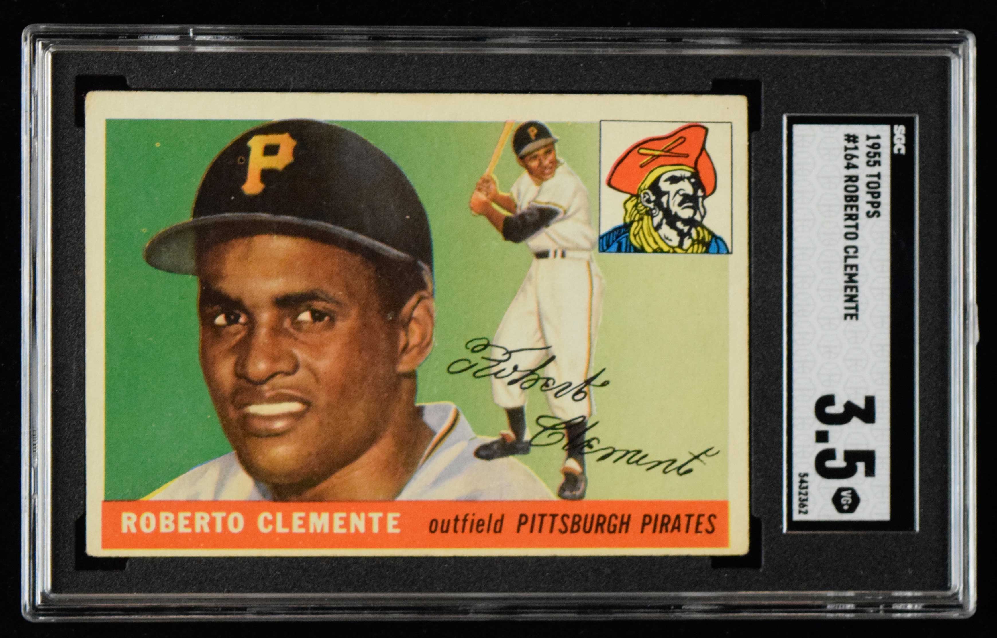 1955 Topps #164 Roberto Clemente Rookie (SGC 3.5 VG+) Light general wear and centering which favors the lower edge: SGC 3.5 VG+ ($1,500-$2,000)