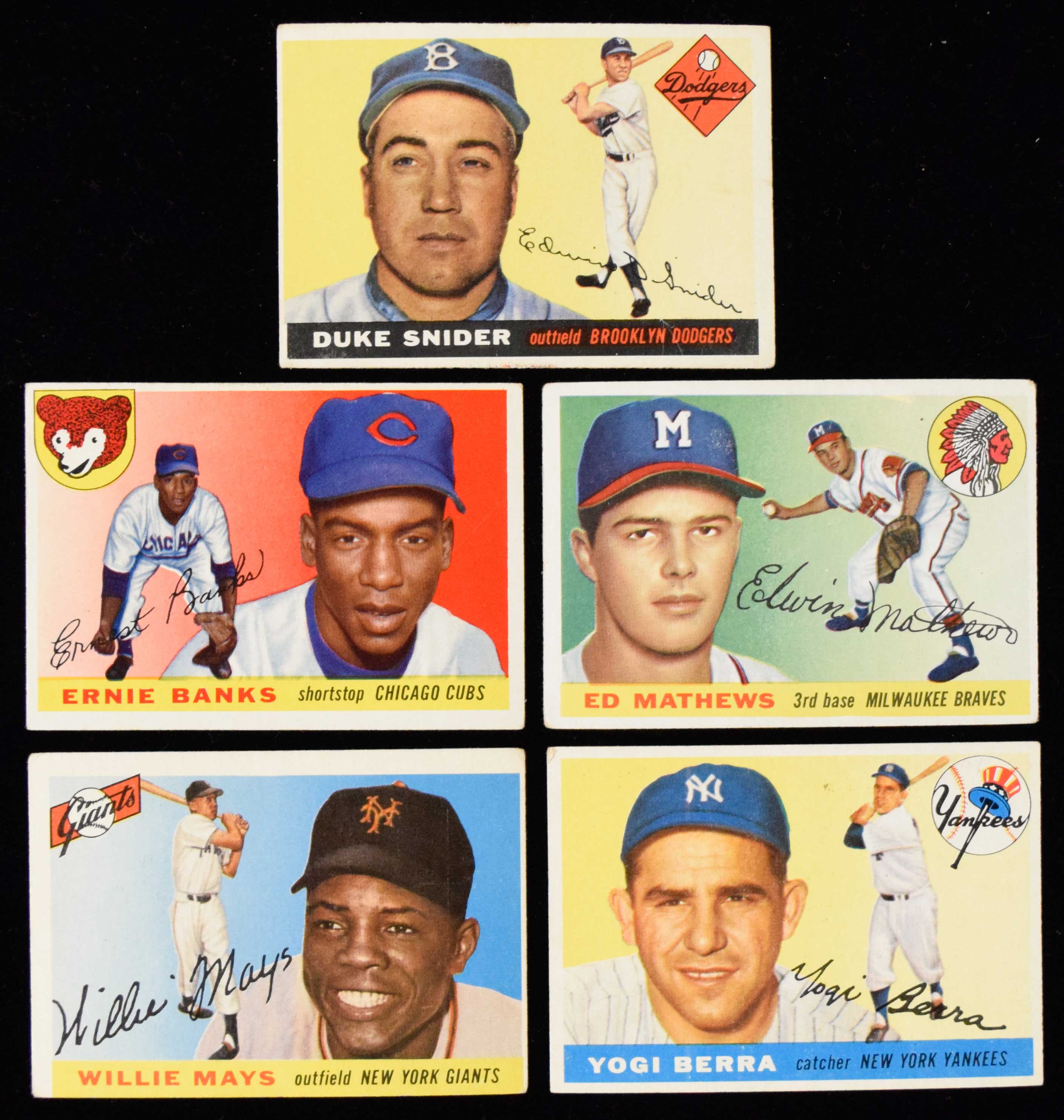 1955 Topps Baseball near complete set (200 of 206 cards) (Avg. VG) Average VG condition with GD-VG/EX general range. Keys: #4 Kaline (GD), 28 Banks (VG), 31 Spahn (GD/VG), 100 Irvin (GD/VG), 120 Kluszewski (VG/EX), 155 Mathews (GD), 187 Hodges (miscut), 189 Rizzuto (miscut), 194 Mays (miscut), 198 Berra (VG), and 210 Snider (GD-GD/VG). Missing #2 Williams, 47 Aaron, 50 Robinson, 123 Koufax, 124 Killebrew, and 164 Clemente: Avg. VG ($1,000-$2,000)