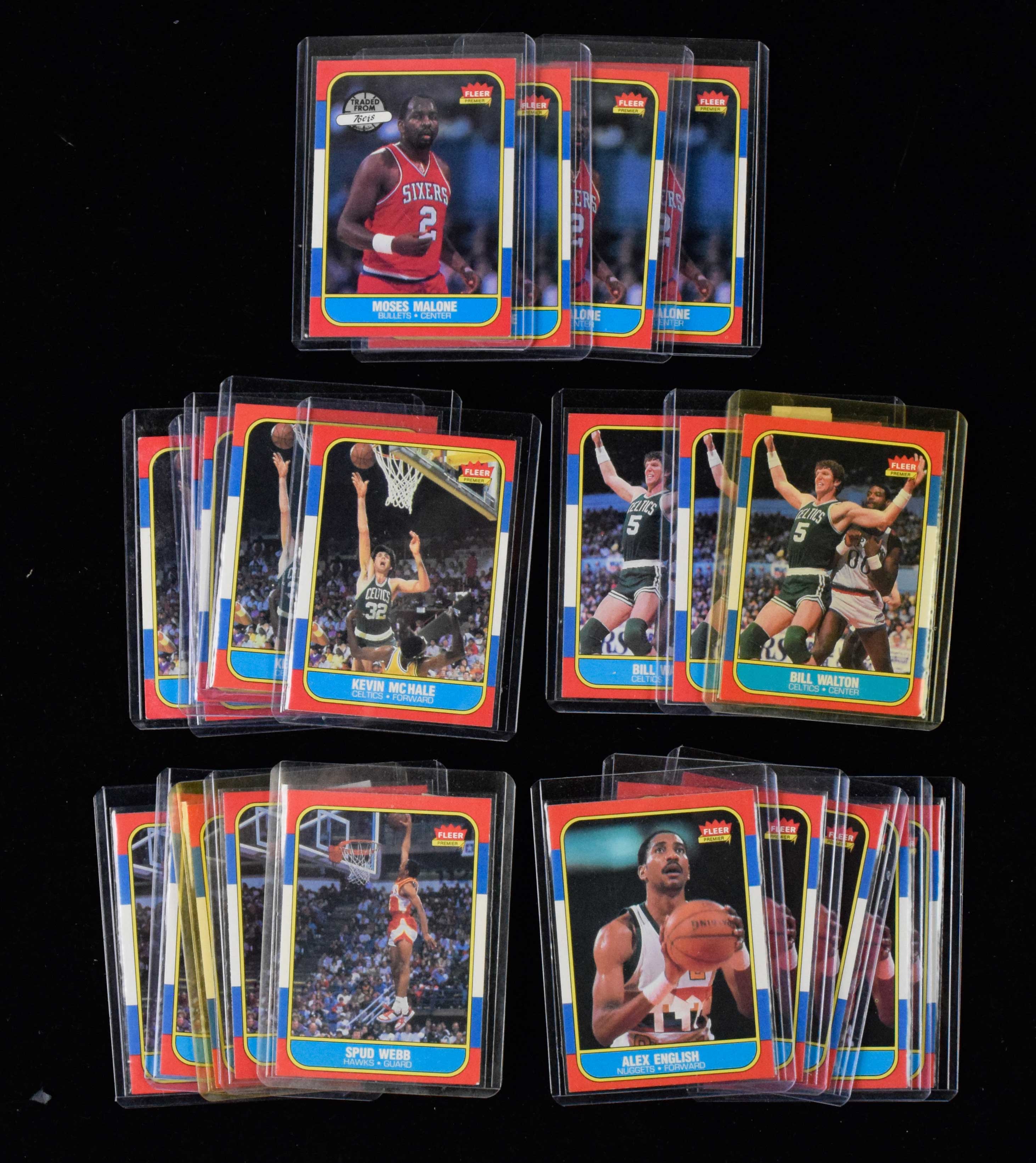 Description:Large lot of approx. (550) 1986-87 Fleer Basketball mostly high grade cards (EX-NM with some better) Very sharp lot of 1986 Fleer with nearly all cards having "pack fresh" appearance and average grade in the EX/MT-NM and NM range with a good number better (there may be some which grade lower mixed in). Each card is stored in a top loader and many are additionally in a penny sleeve. Duplication throughout. Notables (with quantity listed beside name) include (5) Spud Webb, (5) Sam Perkins, (4) Moses Malone, (6) Artis Gilmore, (5) Adrian Dantley, (5) Robert Parrish, (5) Alex English, (3) George Gervin, (3) Bill Walton, (5) Kevin McHale, and (3) Danny Ainge: EX-NM with some better ($1,000-$2,000)