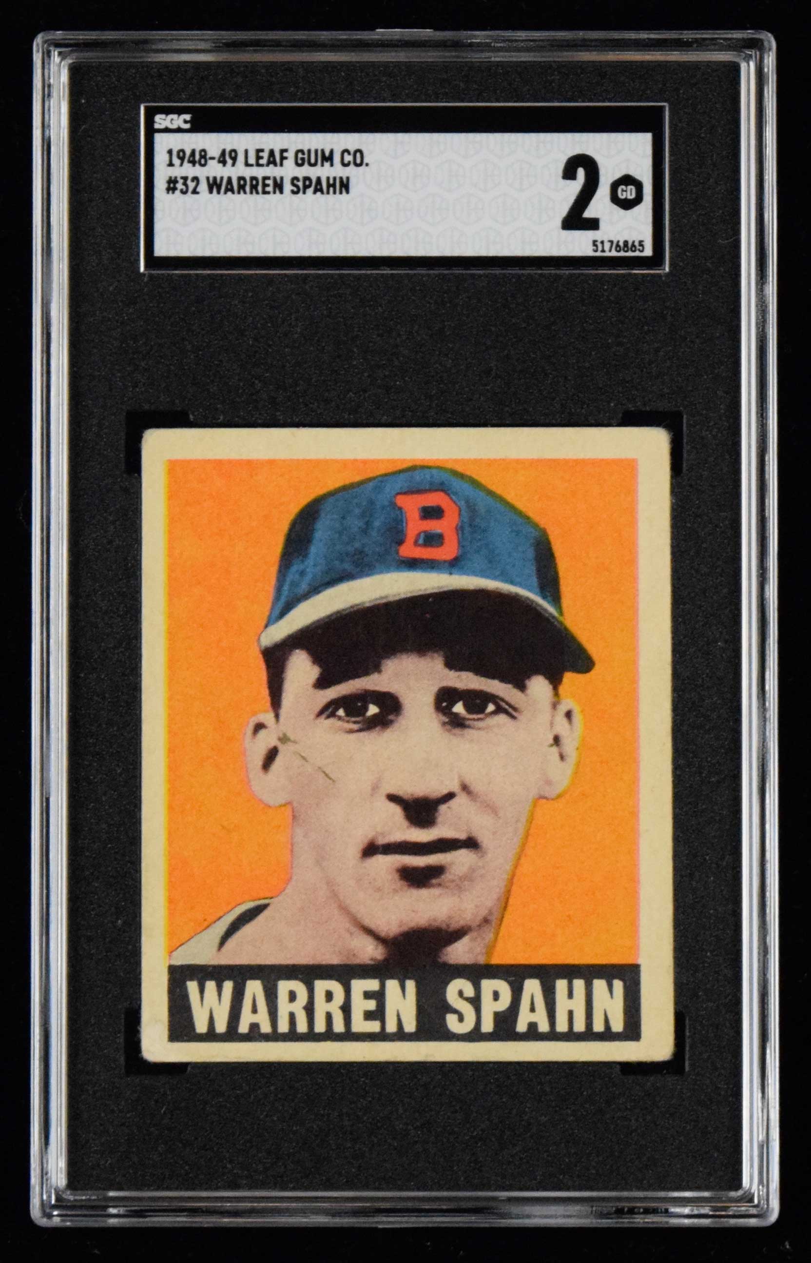 Description:1948 Leaf #32 Warren Spahn (SGC 2 GD) Very sharp eye appeal for the grade with bright and bold color and some light corner wear. A crease/wrinkle which can be seen when viewing the back of the card is not visible on front: SGC 2 GD ($400-$600)