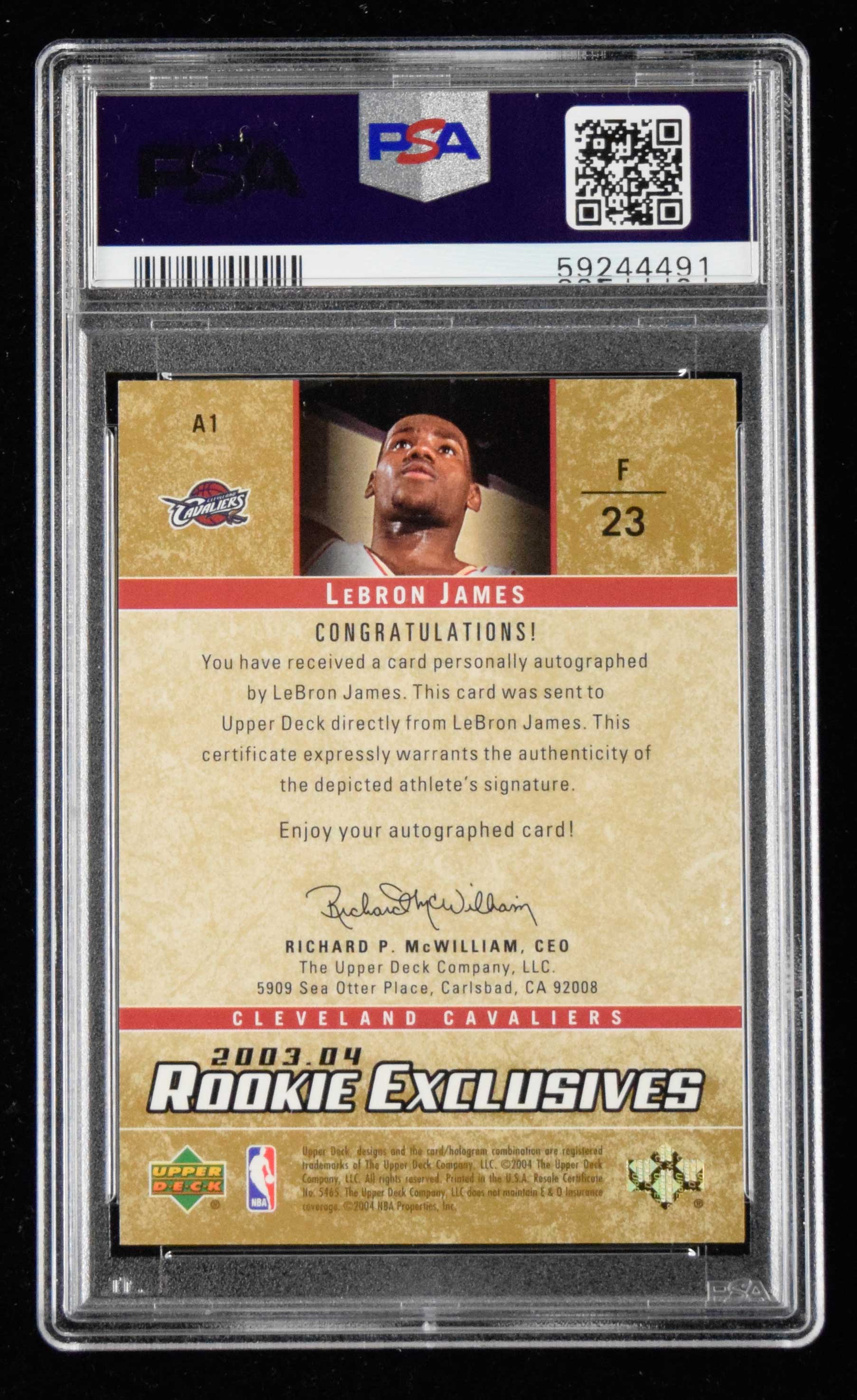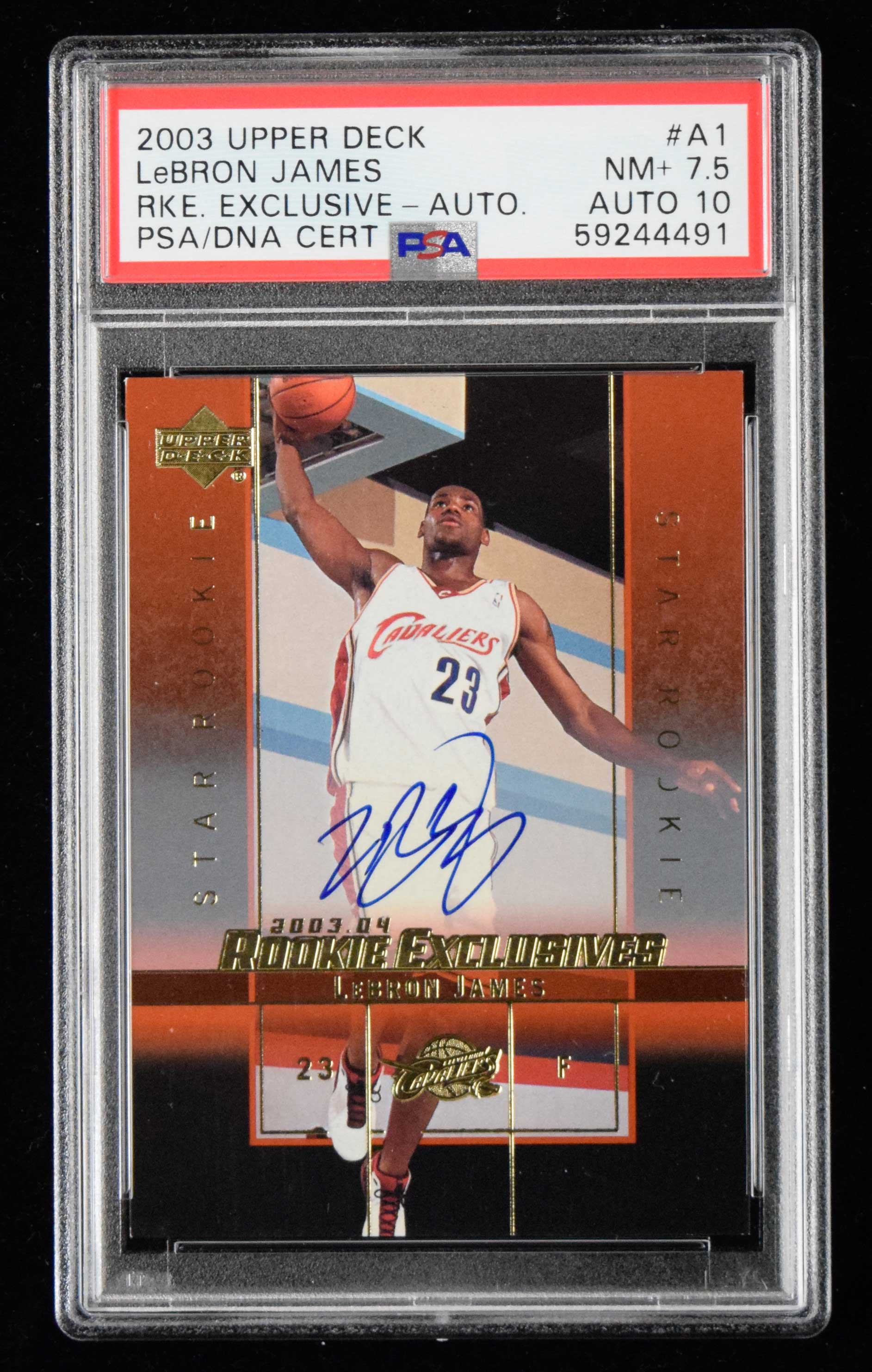 Description:2003 Upper Deck Rookie Exclusives #A1 LeBron James Rookie Auto with PSA "10" autograph grade (PSA NM+ 7.5 with "10" graded auto) Rare Rookie year insert featuring a marker signature on the front which has been graded "10" by PSA. Card is graded "7.5" with the slighest touch to extreme corners: PSA NM+ 7.5 with "10" graded auto ($5,000-$7,500)