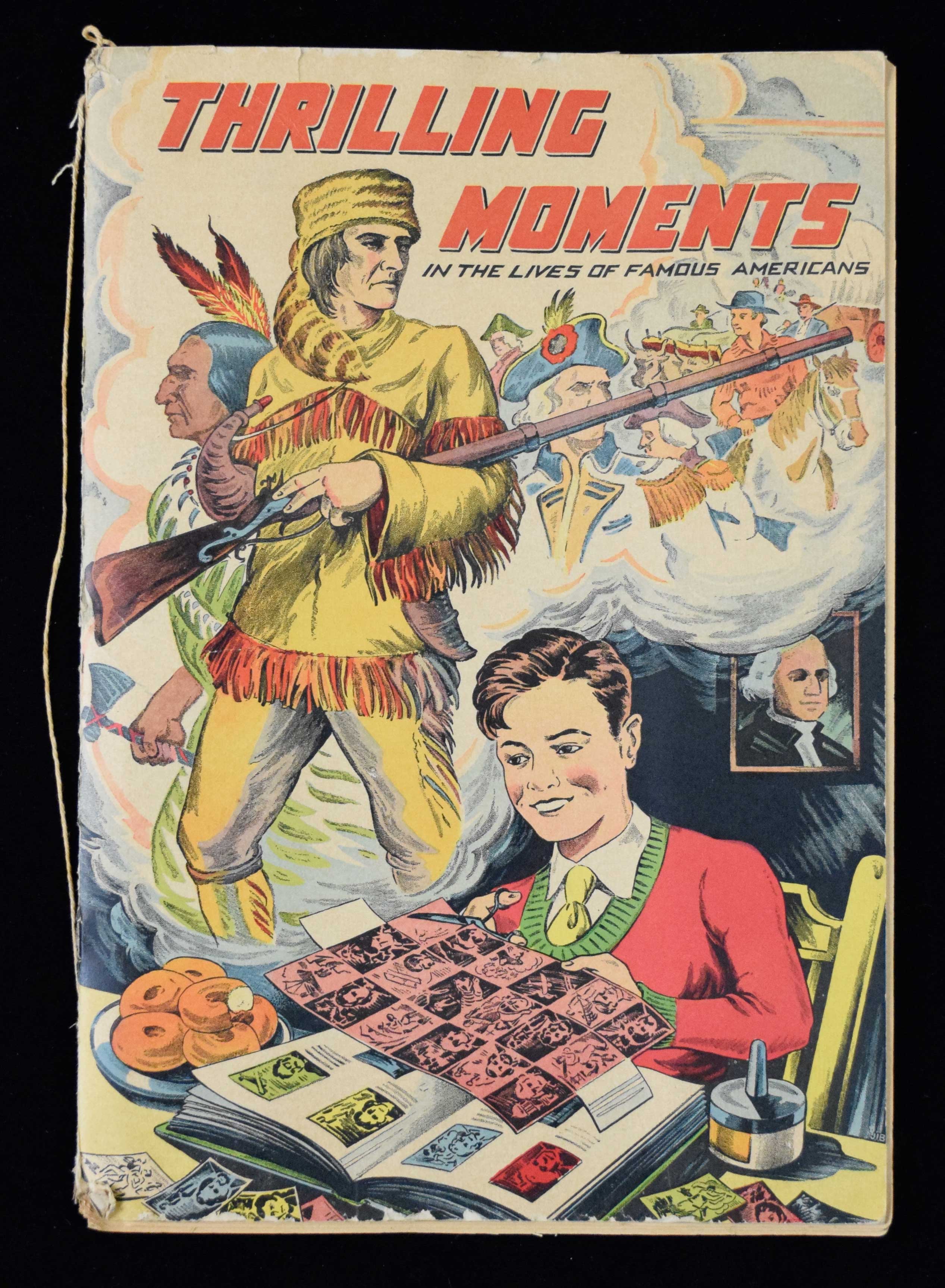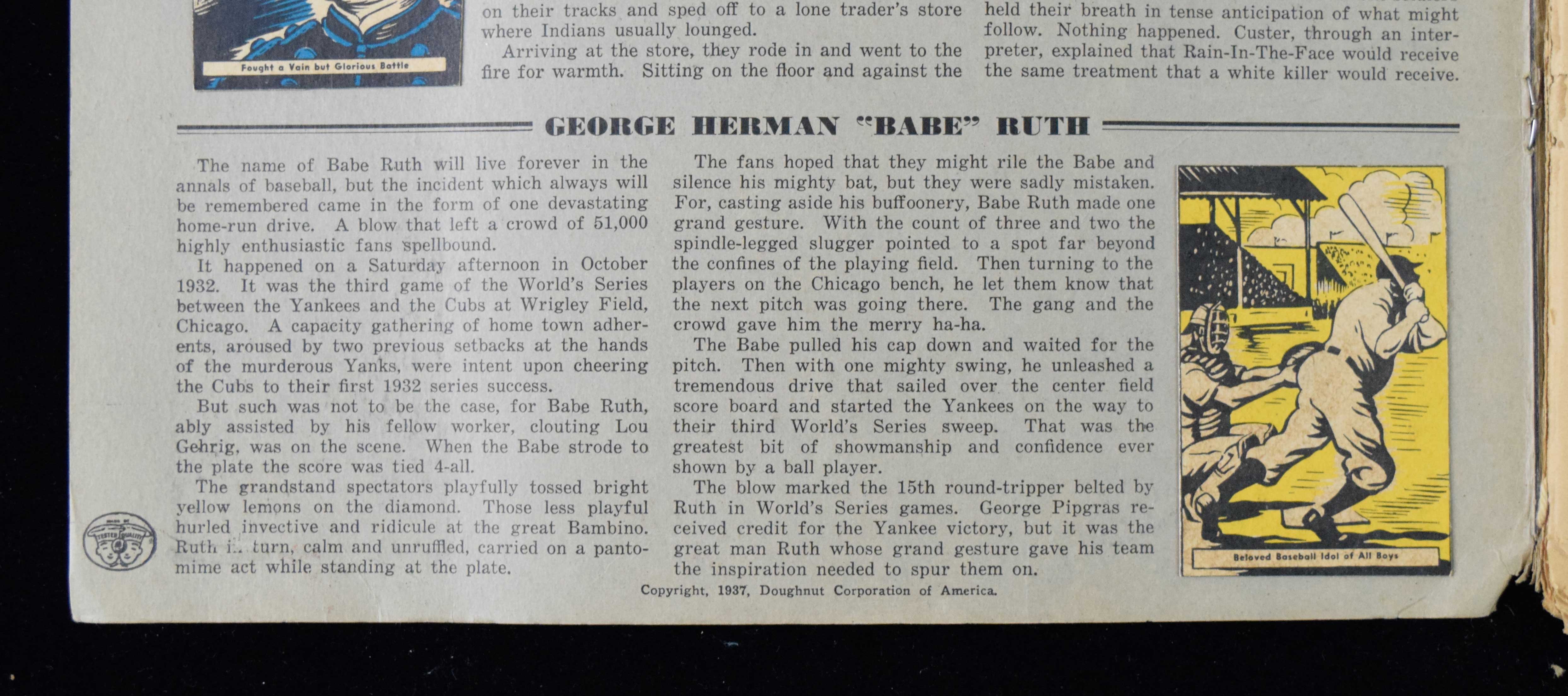 Description:1937 "Thrilling Moments" complete set (72 cards) with Babe Ruth in original album (see description) Oversized paperstock album (10.25"x15") issued by Doughnut Corp. houses a complete set of (72) handcut cards which are then mounted in their proper place with a biography of the subject. Notables include Babe Ruth, Thomas Edison, Amelia Earhart (chip to corner of card), Bill Tilden, Jack Dempsey, Theodore Roosevelt, Knute Rockne, Sitting Bull, Bobby Jones, Buffalo Bill, Charles Lindbergh, John L. Sullivan, Red Grange, George Washington, and Abraham Lincoln. Cards would likely grade PR at best if removed (due to back damage/residue) however they have a far better appearance. Mild general wear to album which has some chipping/creases to corners/edges and interior pages are loose: see description ($500-$1,000)