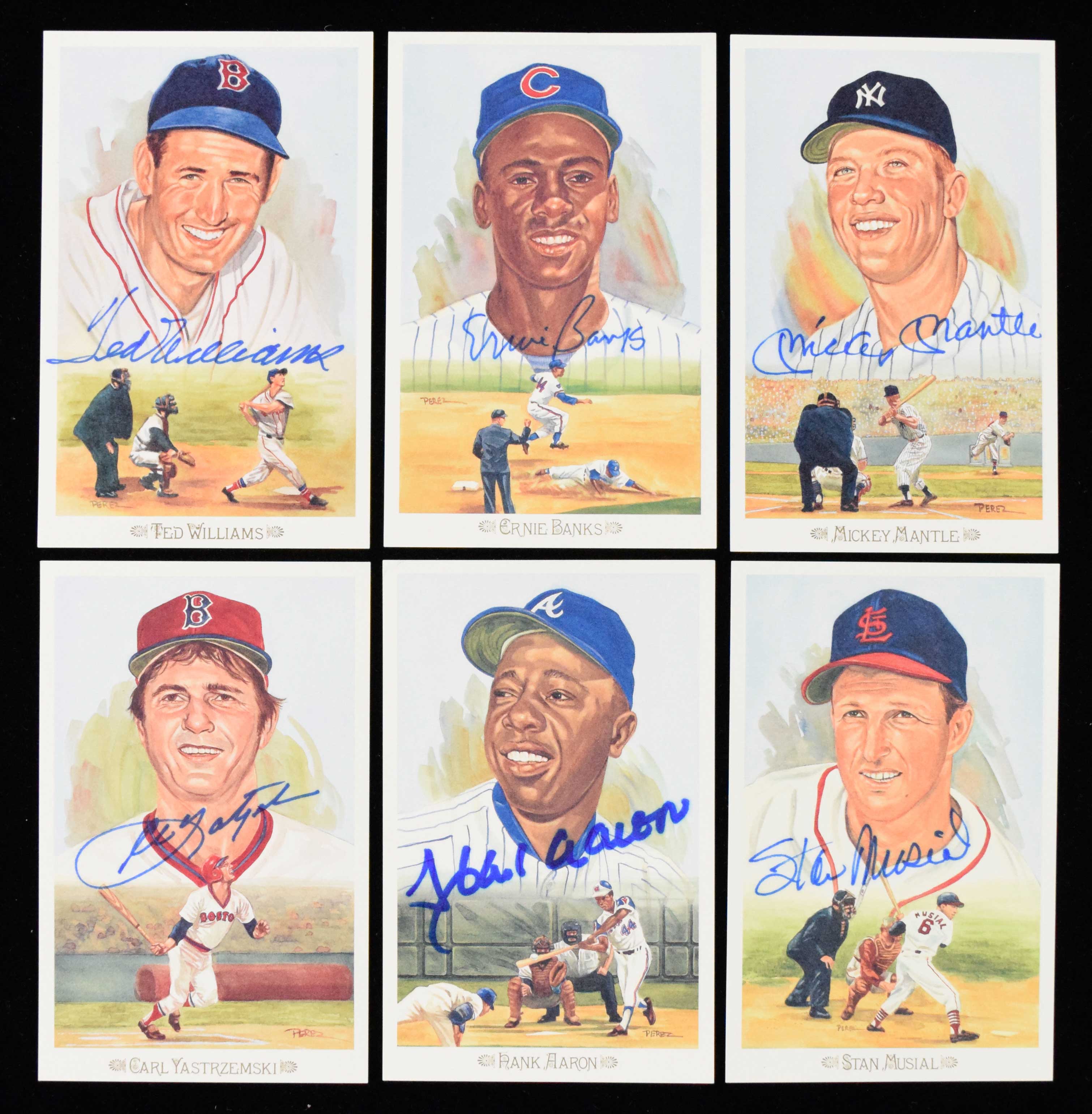 Description:1989 Perez-Steele Celebration postcard set with (37) autographed incl. Mantle and Williams (EX/MT-NM) Complete set of (44) postcards with the following autographed: Hank Aaron, Luis Aparicio, Ernie Banks, Johnny Bench, Yogi Berra, Lou Boudreau, Happy Chandler, Ray Dandridge, Bob Doerr, Rick Ferrell, Charlie Gehringer, Billy Herman, Catfish Hunter, Monte Irvin, Al Kaline, George Kell, Harmon Killebrew, Ralph Kiner, Bob Lemon Buck Leonard, Al Lopez, Mickey Mantle, Juan Marichal, Eddie Mathews, Willie McCovey, Johnny Mize, Stan Musial, Pee Wee Reese, Brooks Robinson, Joe Sewell, Enos Slaughter, Duke Snider, Warren Spahn, Willie Stargell, Billy Williams, Ted Williams, and Carl Yastrzemski. Marker signatures rate 7/8 to 9 out of 10: EX/MT-NM ($1,000-$1,500)